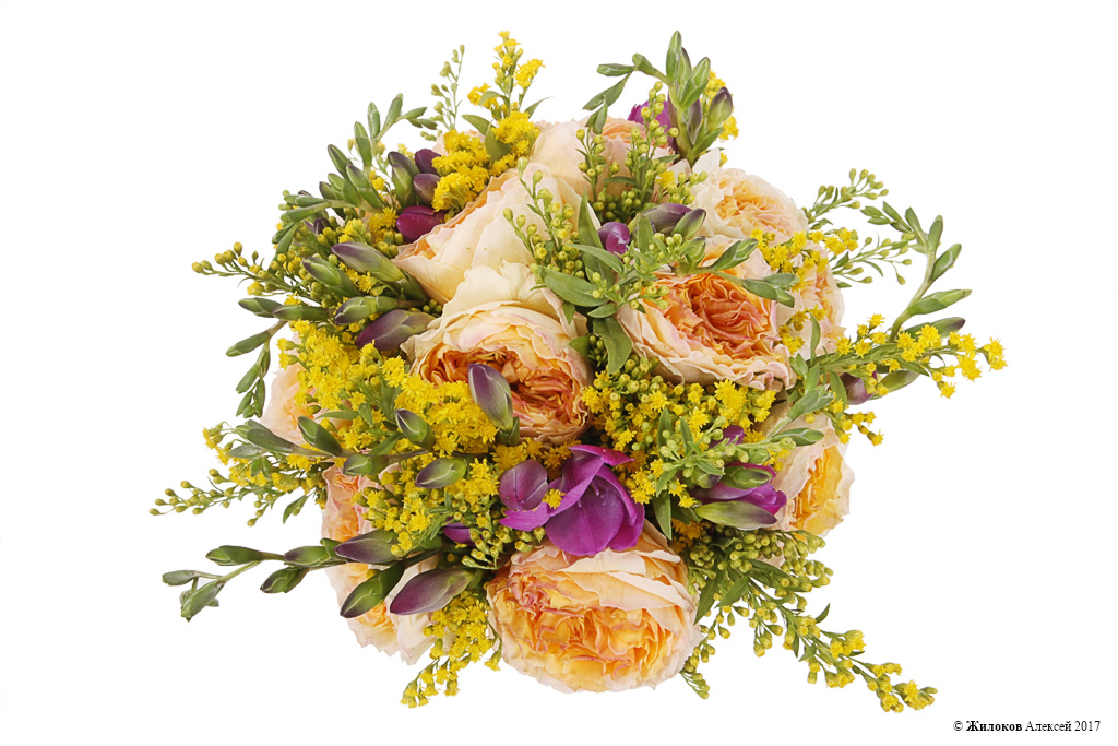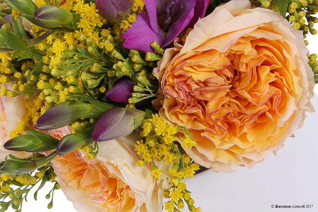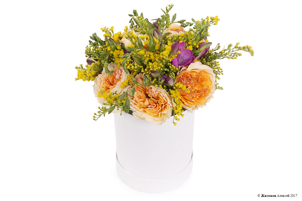 Состав: Роза пионовидная - 12Солидаго - 10 Фрезия - 10 Коробка круглая 14х15 (белая) - 1 |