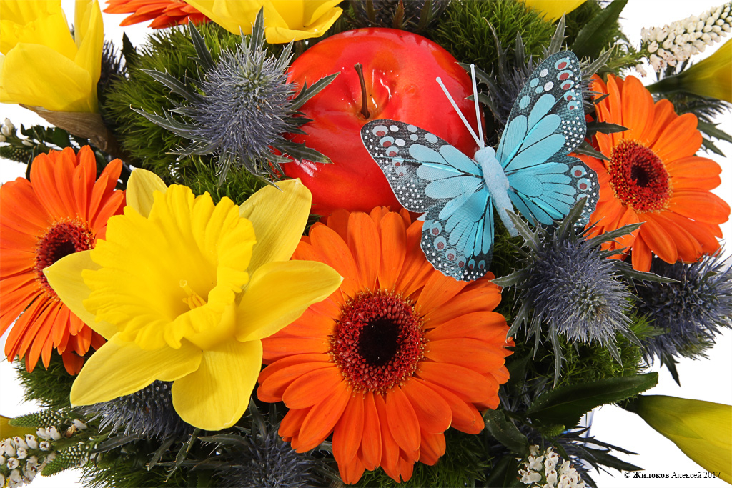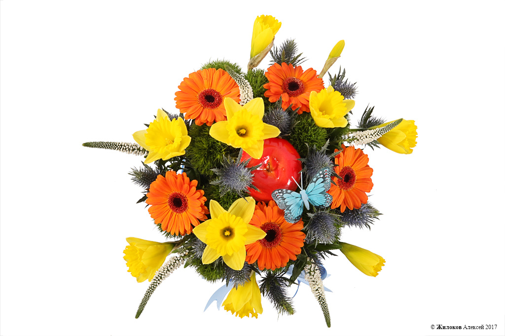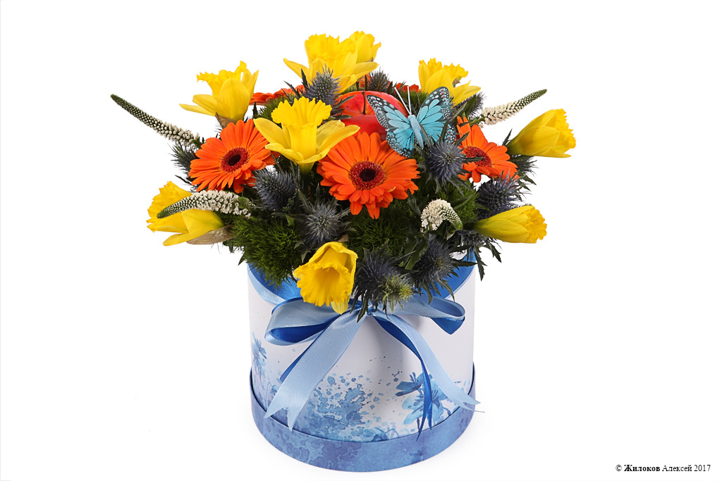Состав: Грин Трикс - 10Нарцисс (деффодайл) - 10 Эрингиум - 5 Вероника - 5 Гербера мини - 5 Декор "Бабочка" - 1 Декор "Яблоко" - 1 Коробка круглая 18х19 (малая) - 1 |