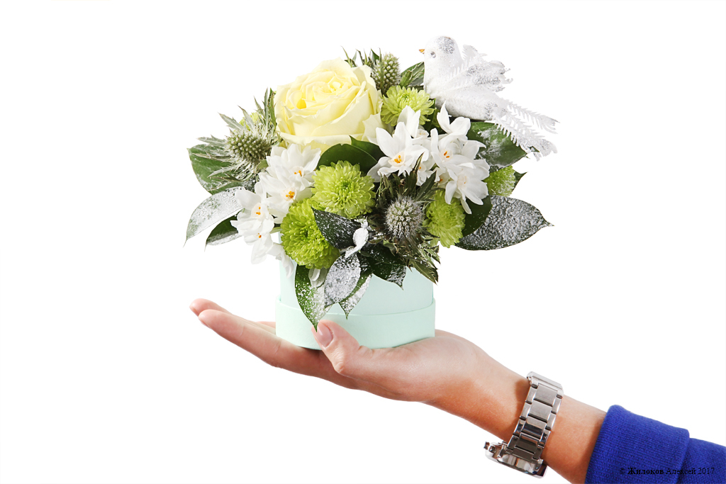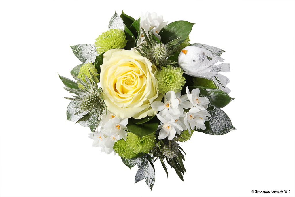 Состав: Нарцисс (деффодайл) - 3Хризантема Сантини - 1 Рускус - 2 Эрингиум - 1 Украшение "Птица" - 1 Роза Фламандский микс - 1 Коробка для цветов 9х9 (мини) - 1 |