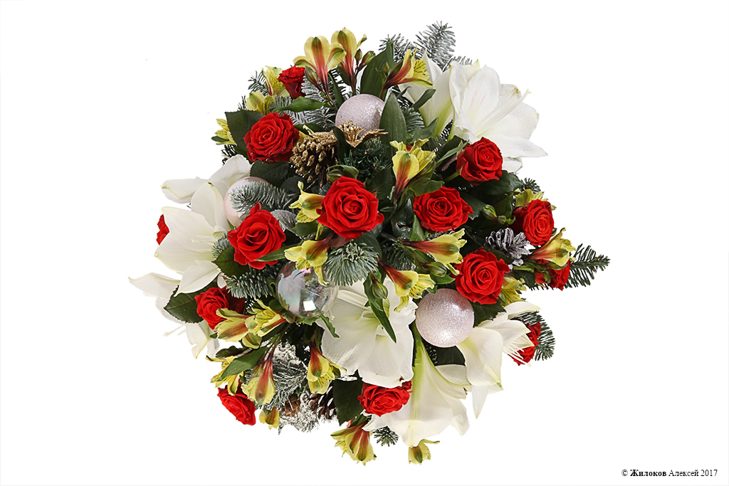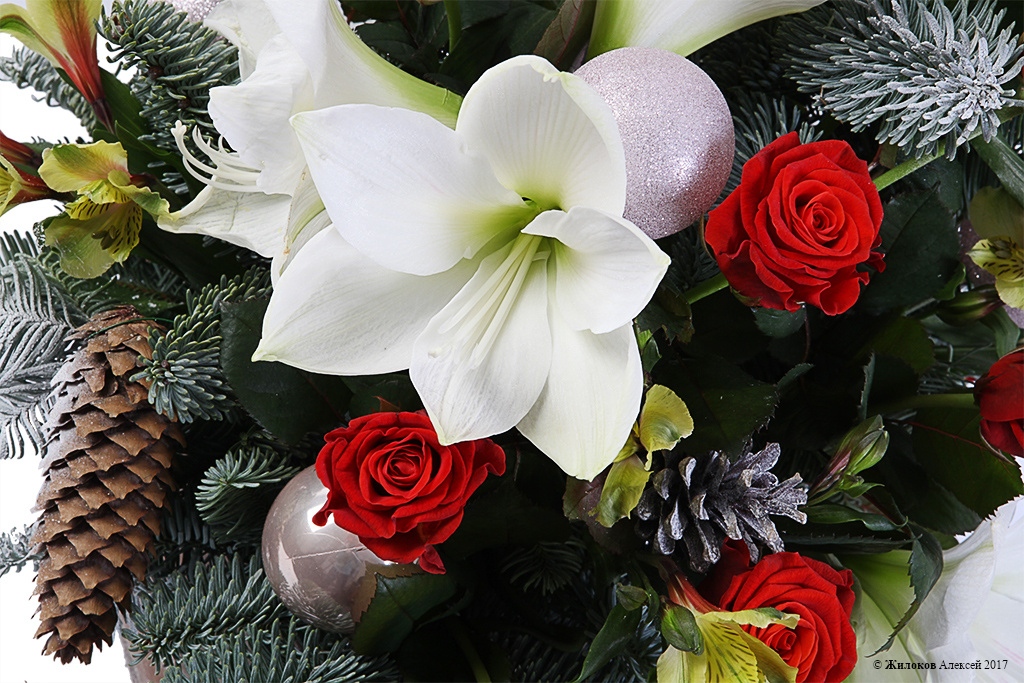 Состав: Нобилис - 3Роза Ред Наоми - 15 Гиппеаструм - 2 Альстромерия - 5 Шар новогодний - 5 Кашпо "Сердце" - 1 |