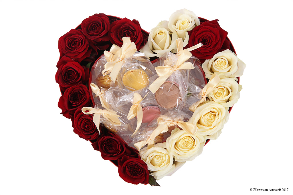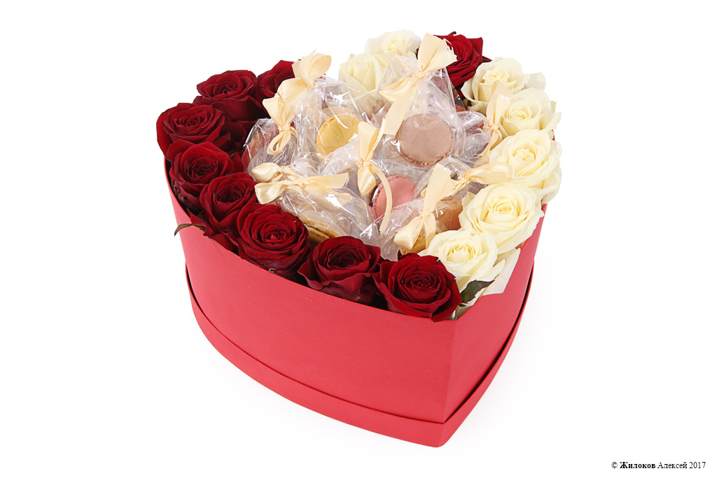 Цветочная композиция из бордовых и белых роз, составленная в коробке в форме сердца, покорит с первого взгляда! Это прекрасный и желанный подарок для любой девушки! Также великолепным дополнением к цветам послужит превосходное французское лакомство - пирожные макарун, которые придутся по вкусу любому сладкоежке!