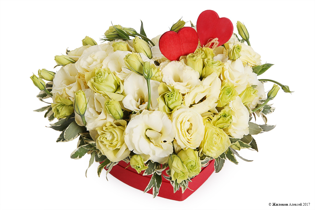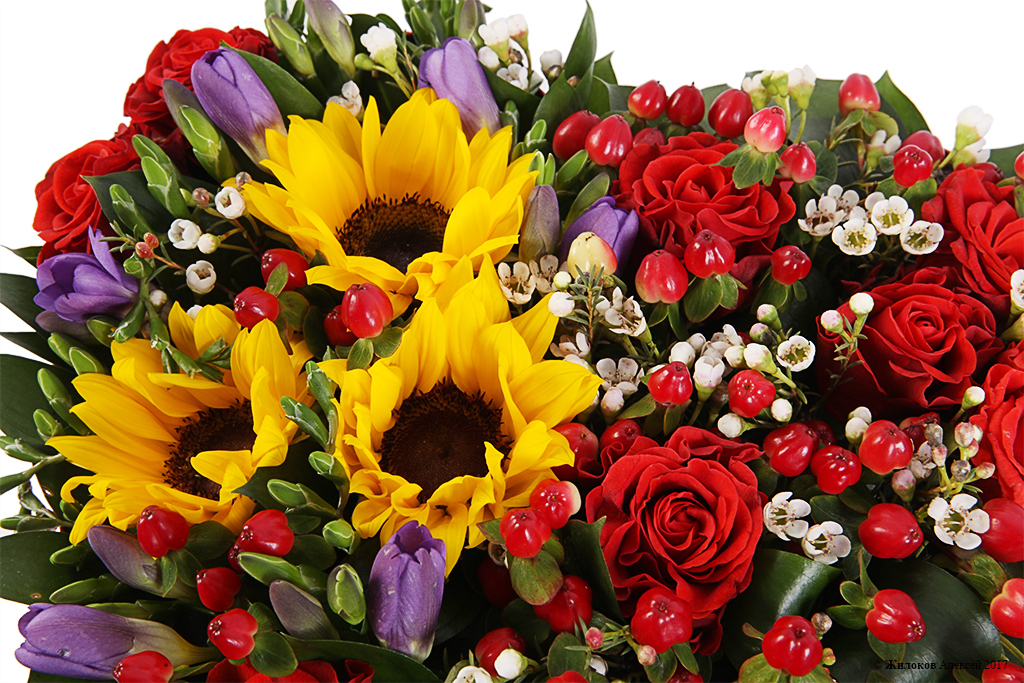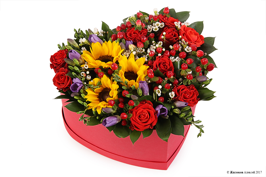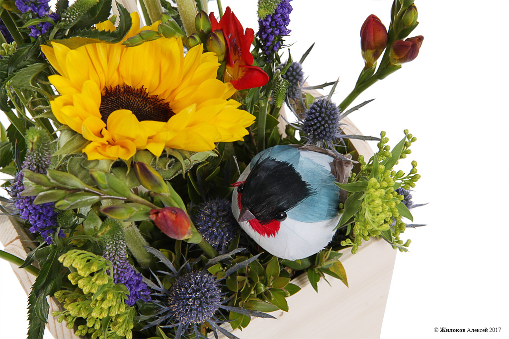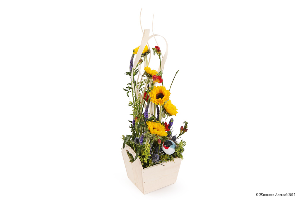 Состав: Скиммия - 1Гиперикум - 4 Роза Ред Наоми - 17 Роза кустовая (Кения) - 5 Леукадендрон - 1 Кашпо "Домик" - 1 |