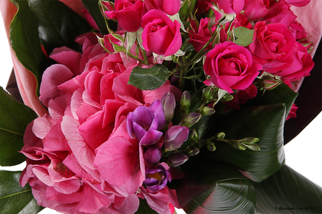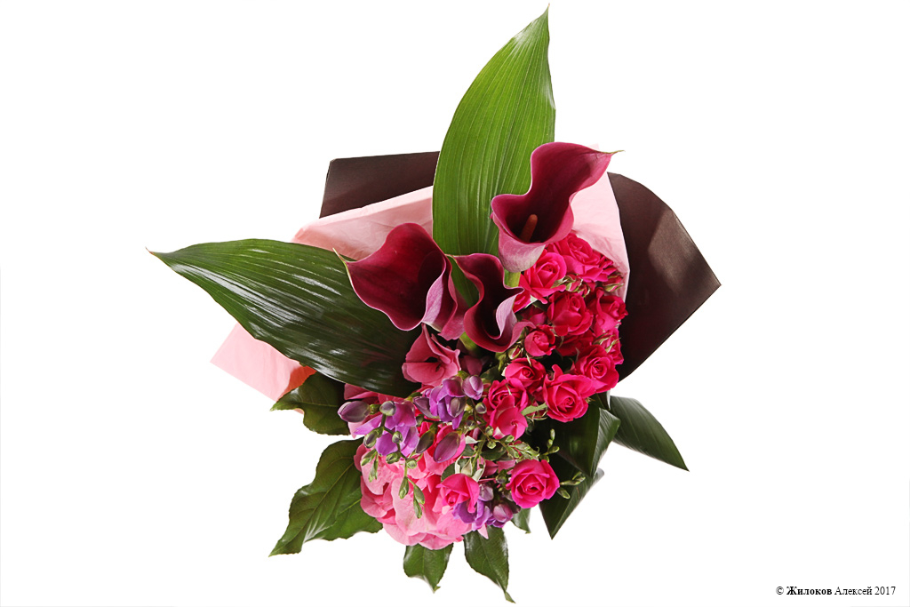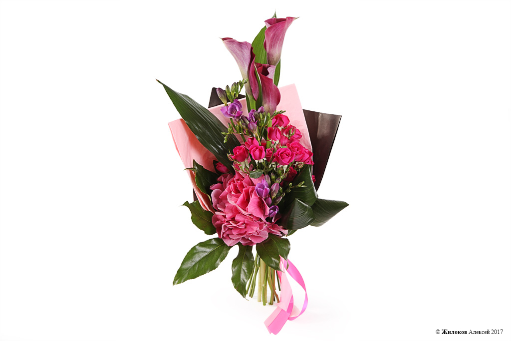 Состав: Гортензия - 1Калла - 3 Роза Алисия - 5 Фрезия - 5 Аралия - 1 Аспидистра - 7 Упаковка - бумага - 2 Атласная лента - 1 |