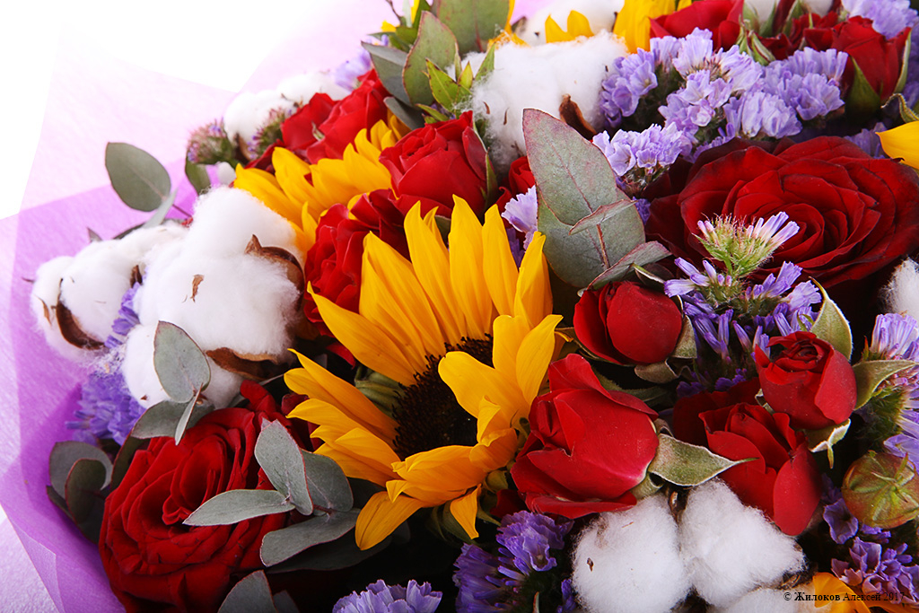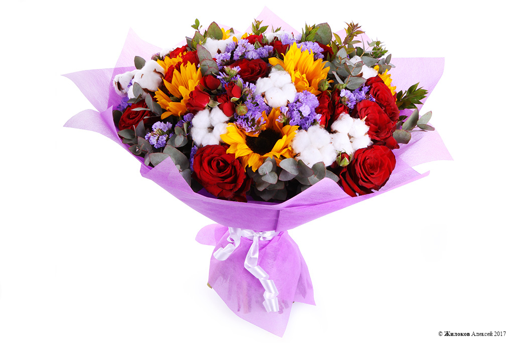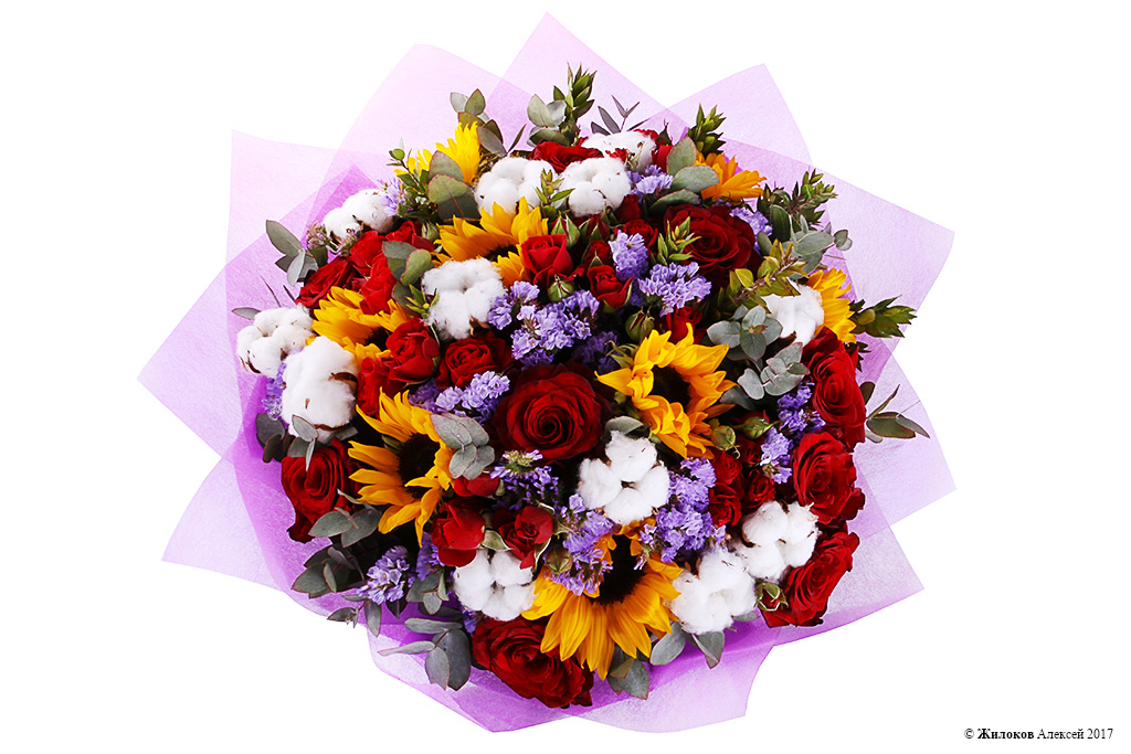 Состав: Роза одноголовая (Эквадор) - 10Хлопок - 2 Статица - 1 Эвкалипт - 2 Подсолнух (гелиантус) - 8 Атласная лента - 1 Роза Мирабель - 5 |