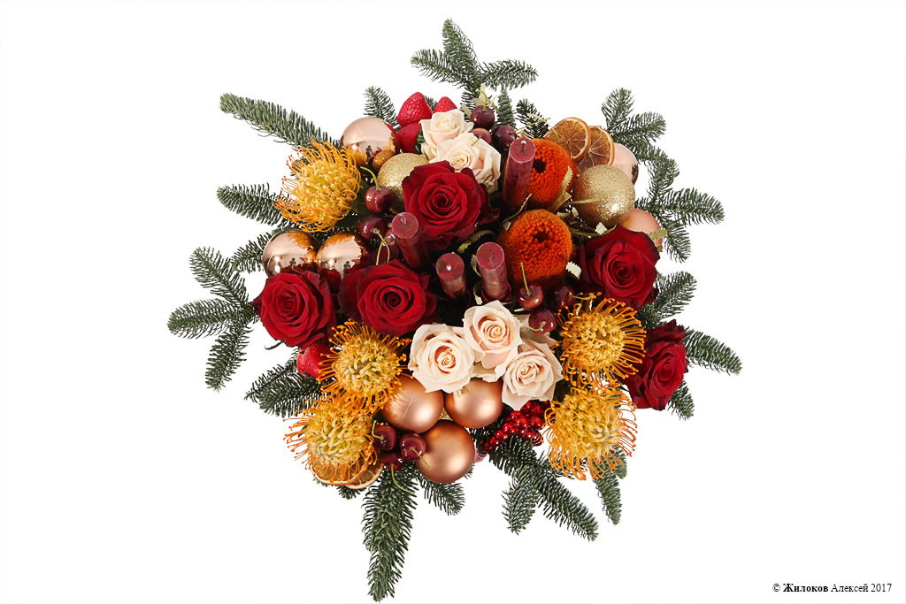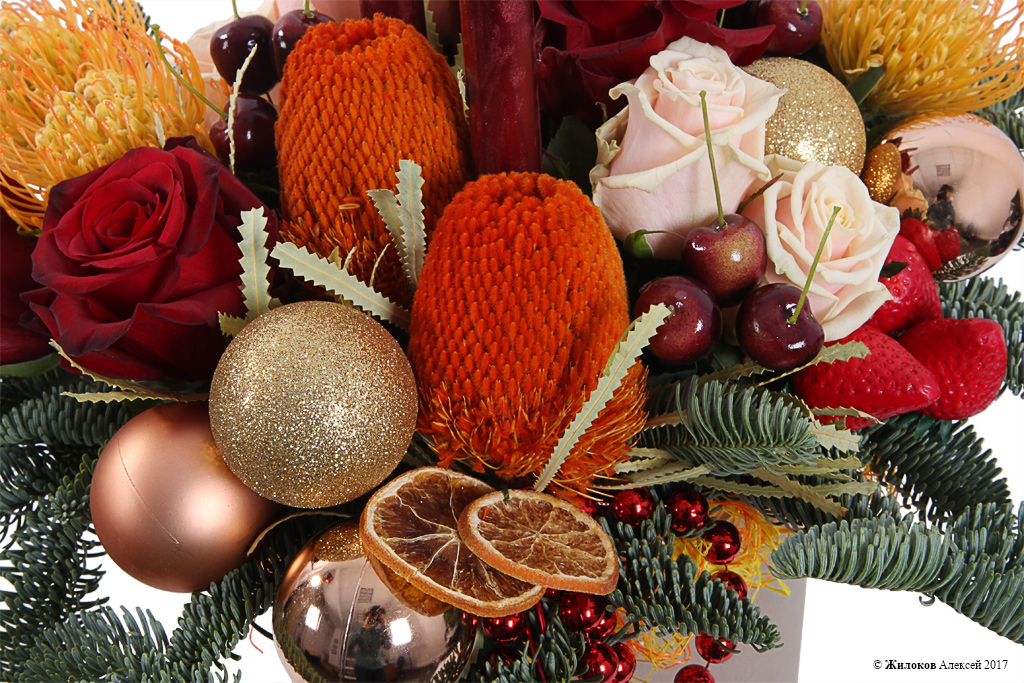 Состав: Нобилис - 2Леукоспермум - 5 Роза Ред Париж - 5 Роза Талея - 5 Банксия - 2 Свеча (25 см) - 4 Шар новогодний - 10 Декор "Клубника" - 5 Декор "Вишня" - 12 Коробка круглая 24х27 (крафт) - 1 Декор - 1 |