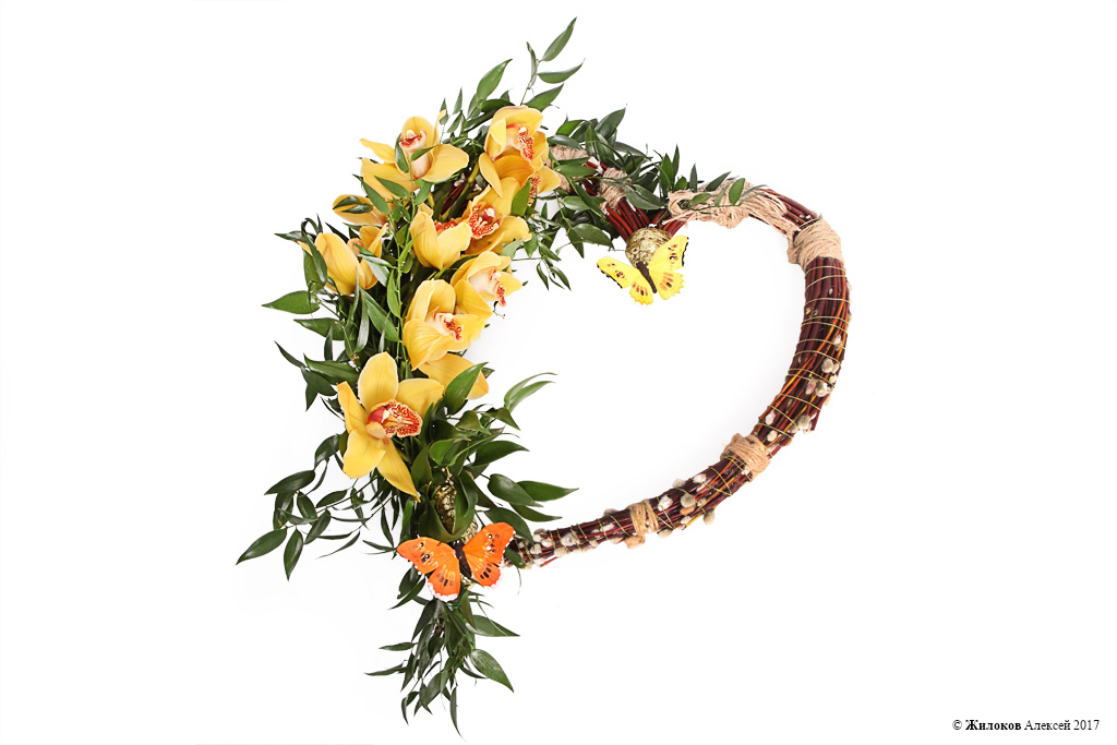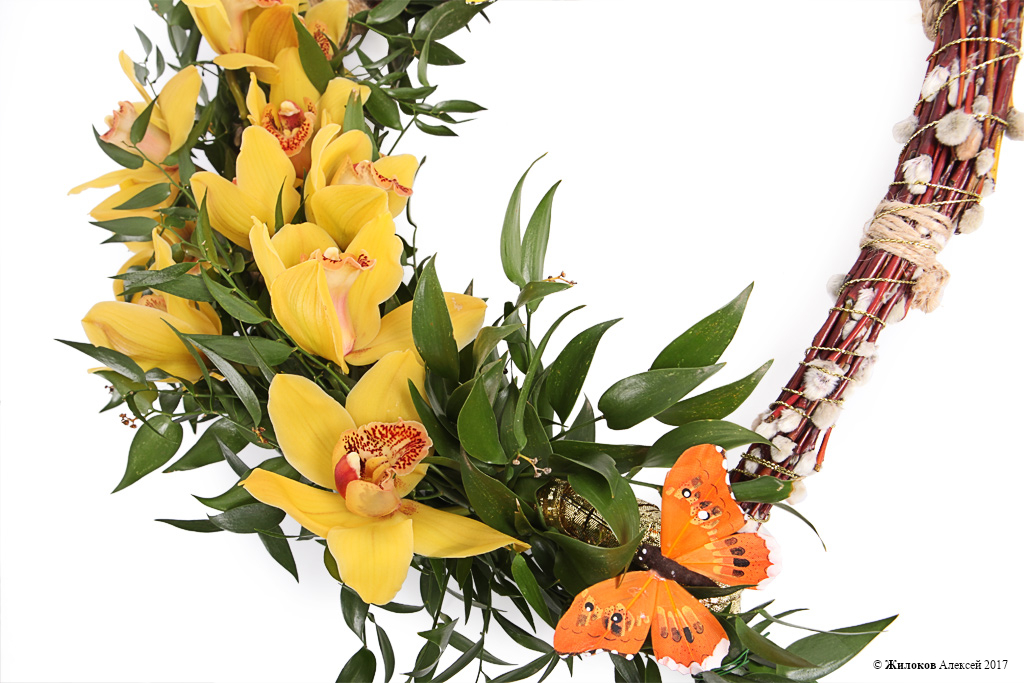 Состав: Орхидея Цимбидиум - 1Рускус Акулеатус - 1 Верба - 7 Декор "Бабочка" - 2 Удлинители для орхидей - 15 |