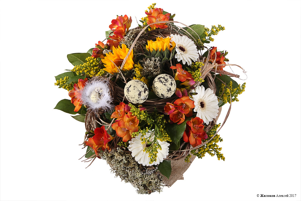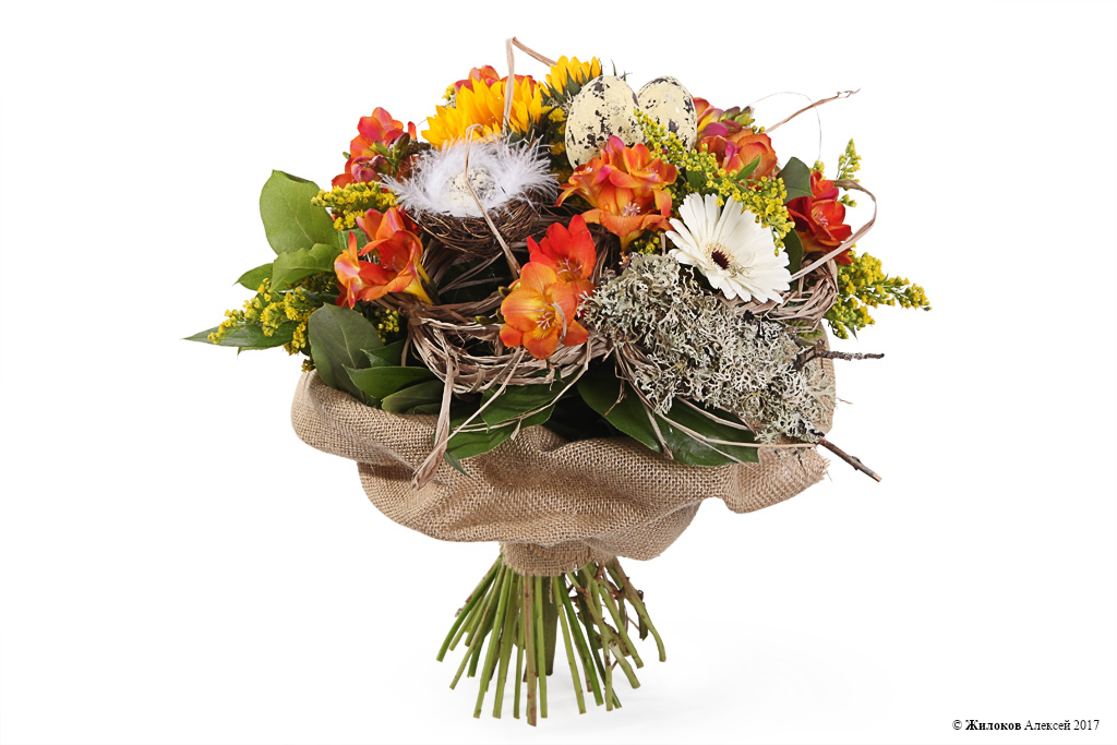 Состав: Гербера мини - 3Солидаго - 10 Фрезия - 10 Подсолнух (гелиантус) - 2 Салал - 1 Украшение на палочке - 3 Мох плаун (100 г) - 1 Упаковка - мешковина - 1 Рафия натуральная - 0.5 |