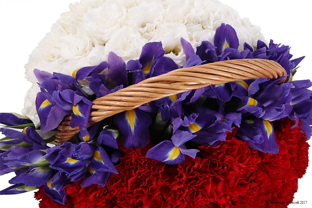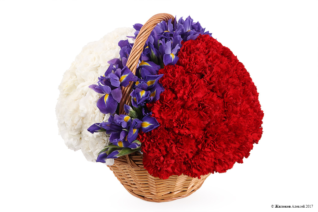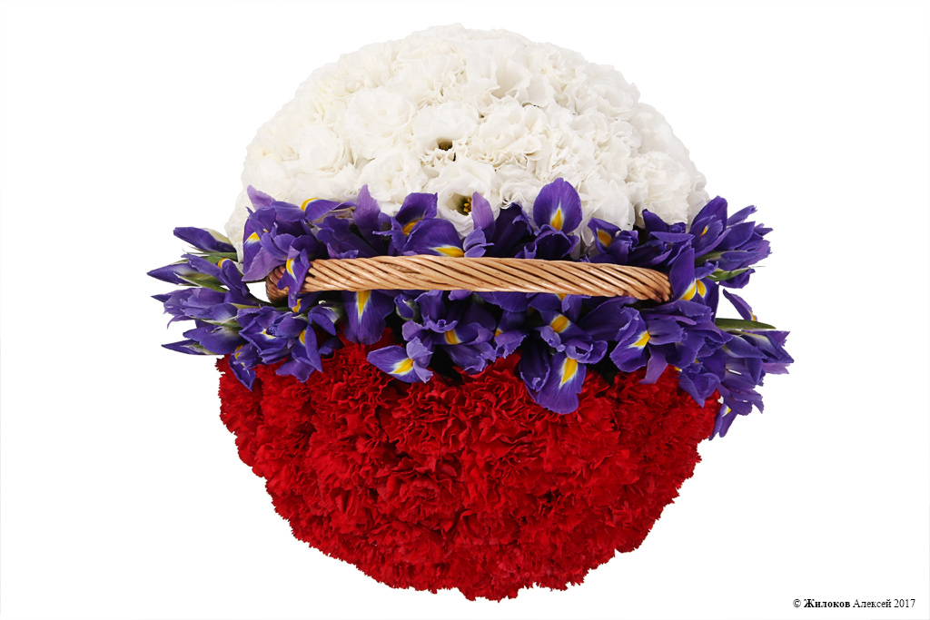 Цветочная корзина в расцветке российского флага - это подарок для настоящих патриотов! Синие ирисы, белая эустома, красные розы станут приятным дополнением к любому интерьеру.