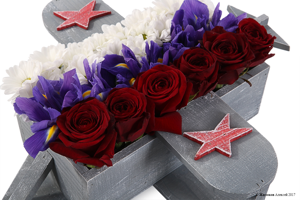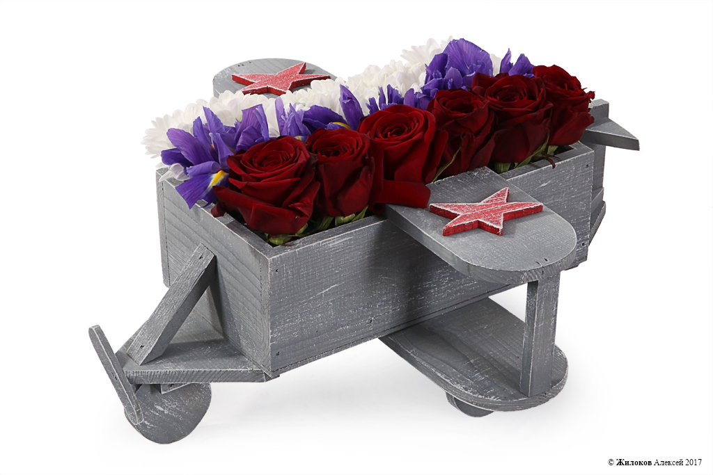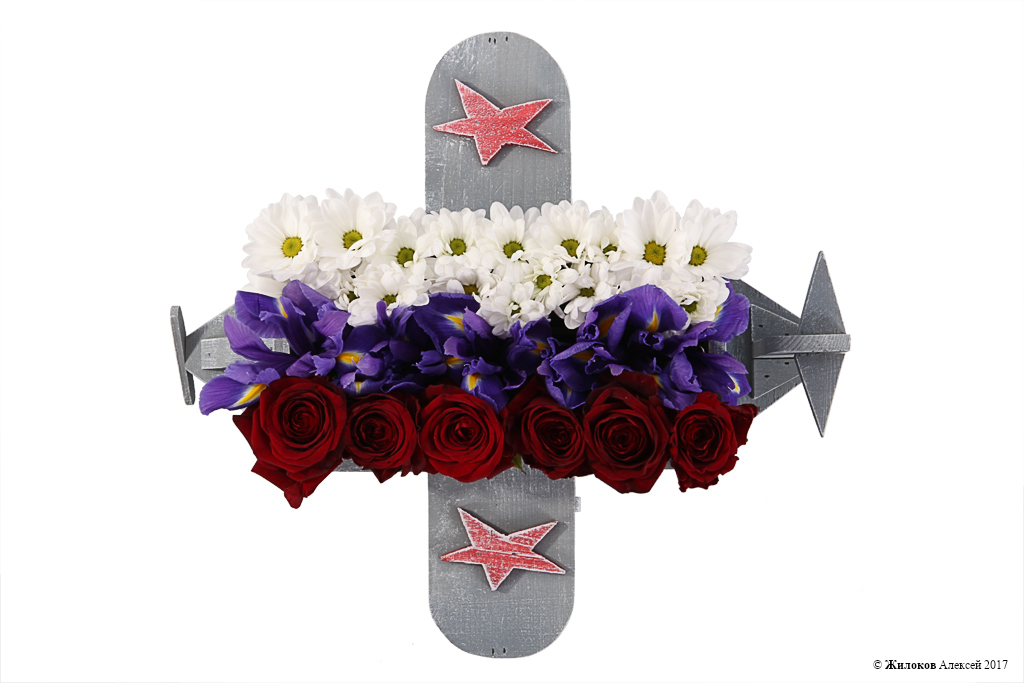 Цветочная композиция, выполненная в расцветке российского флага и в кашпо "Самолет" - это идеальный подарок для настоящих патриотов и тех, кто жить не может без неба и полетов. Прекрасное украшение к торжеству как строго офисного, так и домашнего интерьера!