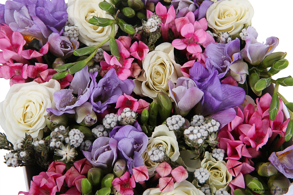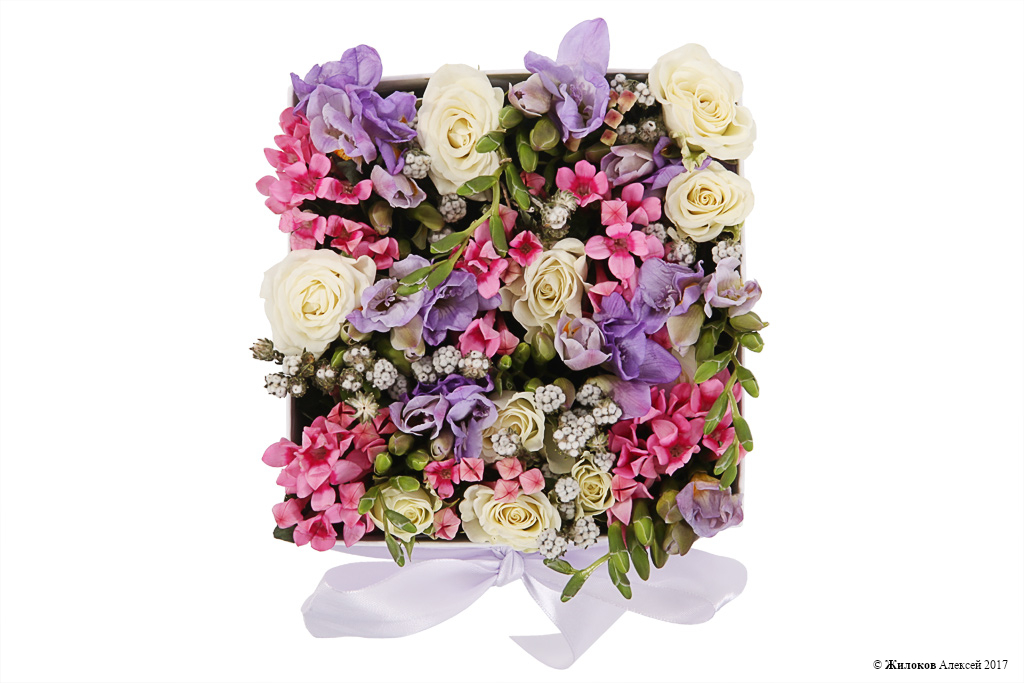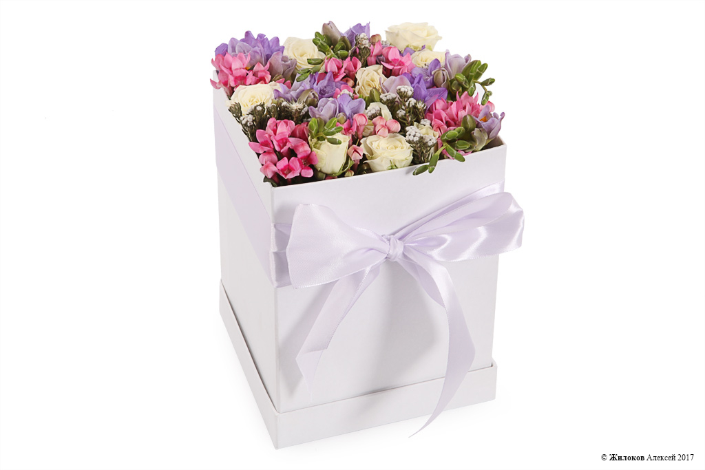 Состав: Роза кустовая (Кения) - 2Фрезия - 10 Коттон Буш - 1 Бувардия - 5 Коробка прямоугольная 15х15х20 (белая) - 1 |