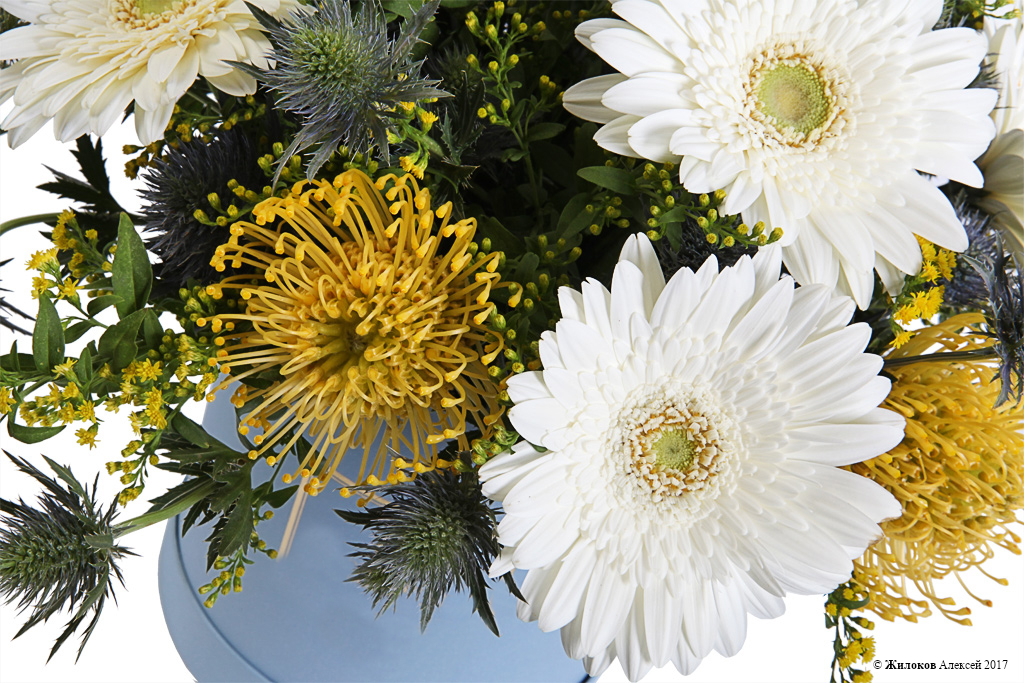 Состав: Гербера - 5Леукоспермум - 3 Солидаго - 10 Эрингиум - 5 Коробка круглая 24х27 (голубая) - 1 |