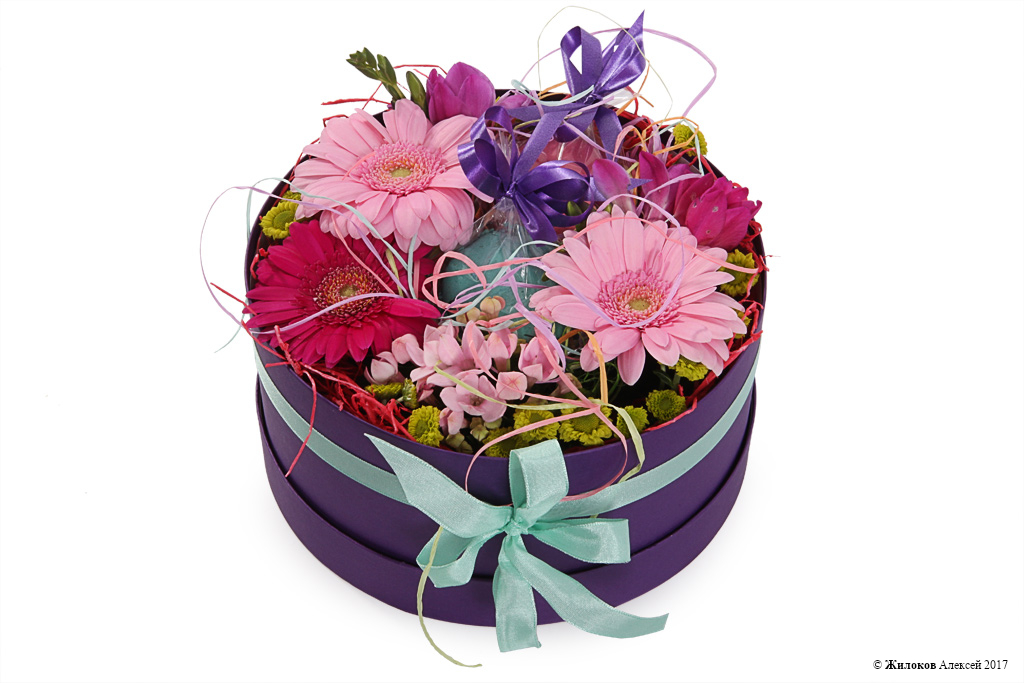 Нежно-розовые герберы, насыщенно-малиновые фрезии, цветочки бувардии и хризантемы сантини, помещенные в миниатюрную коробочку, представляют собой изящную и изысканную цветочную композицию! Чудесный комплимент для любимого человека! |