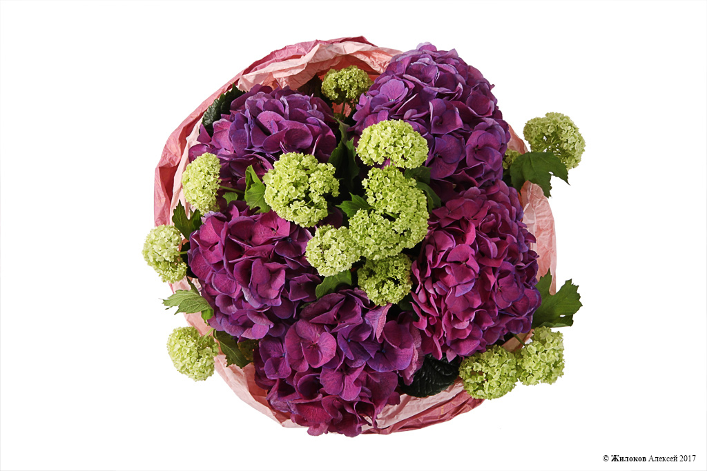 Описание: Пышные шапки фиолетовой гортензии в сочетании с бело-зелеными цветочками вибурнума очаровывает, обвораживает и пленит своей красотой. Такой букет сделает любое поздравление прекрасным и запоминающимся, привнесет настроение праздника и летней беззаботности!