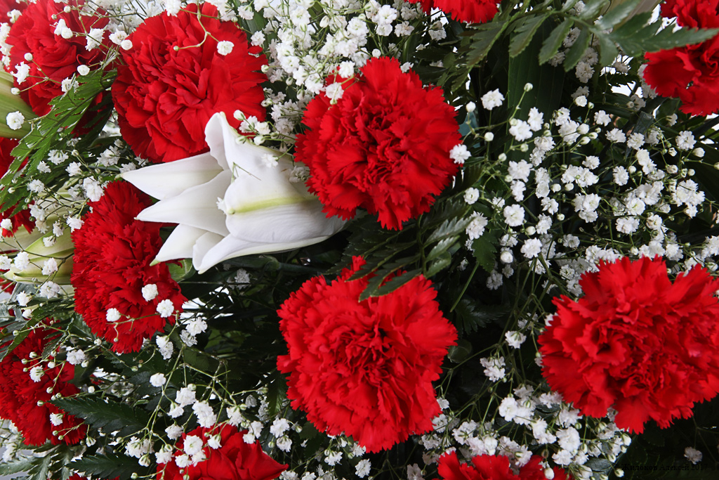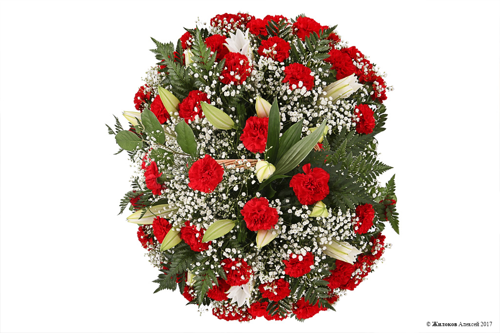 Контрастная цветочная композиция из белоснежных лилий, воздушной гипсофилы и ярких гвоздик подарит фейерверк красочных чувств и эмоций. Прекрасное украшение любого интерьера на любой праздник либо торжество!