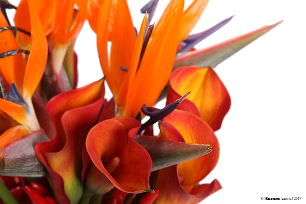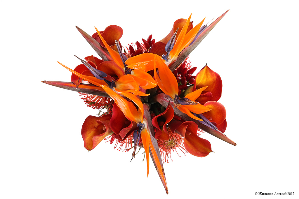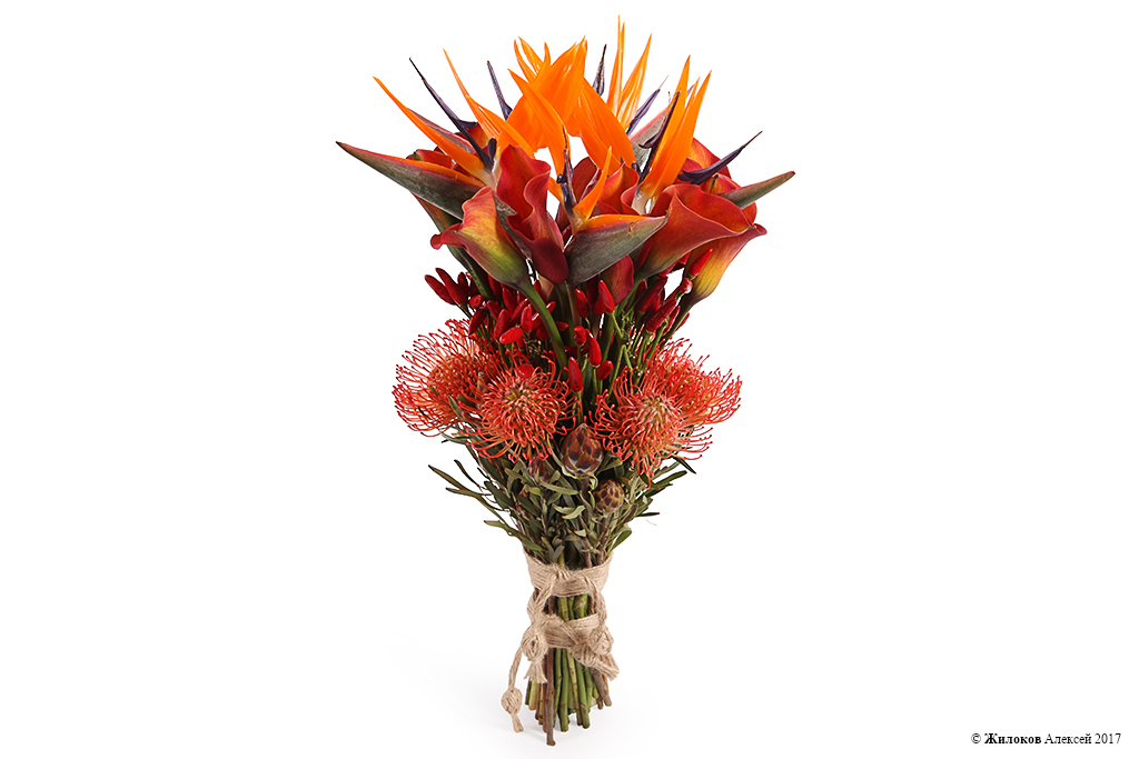 Состав: Стрелиция - 5Перец - 10 Плюмозиум - 1 Калла - 10 Леукоспермум - 6 |