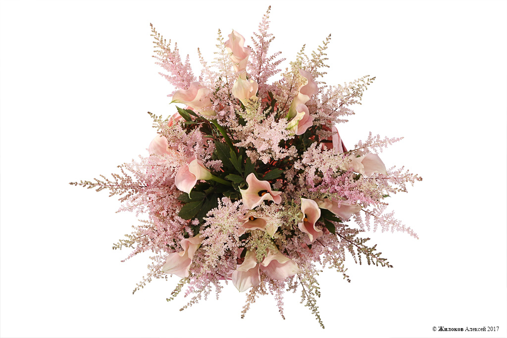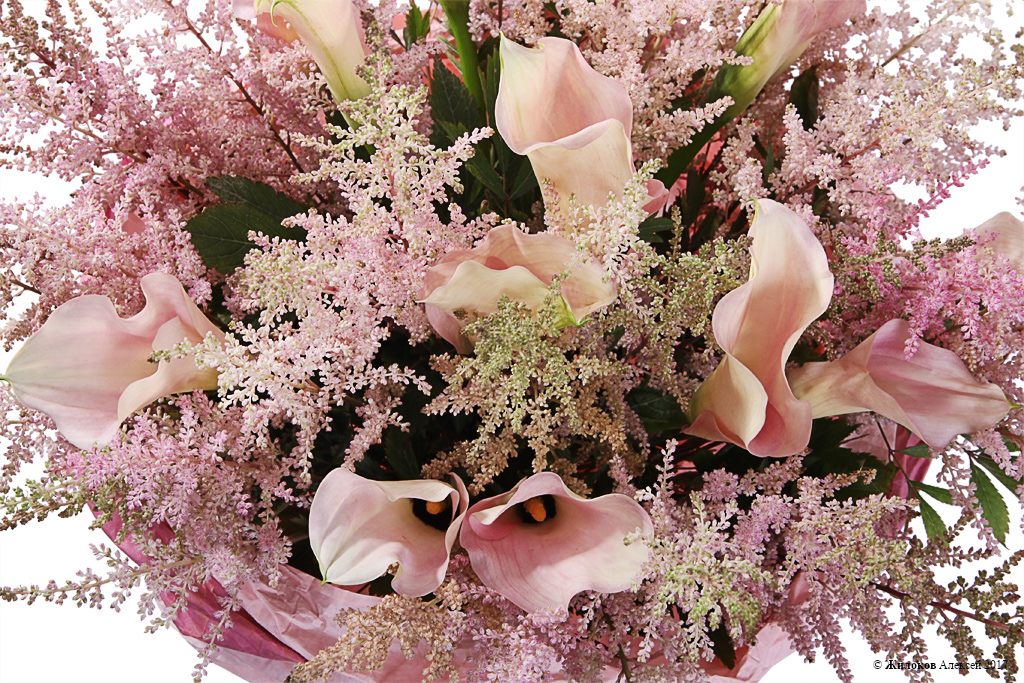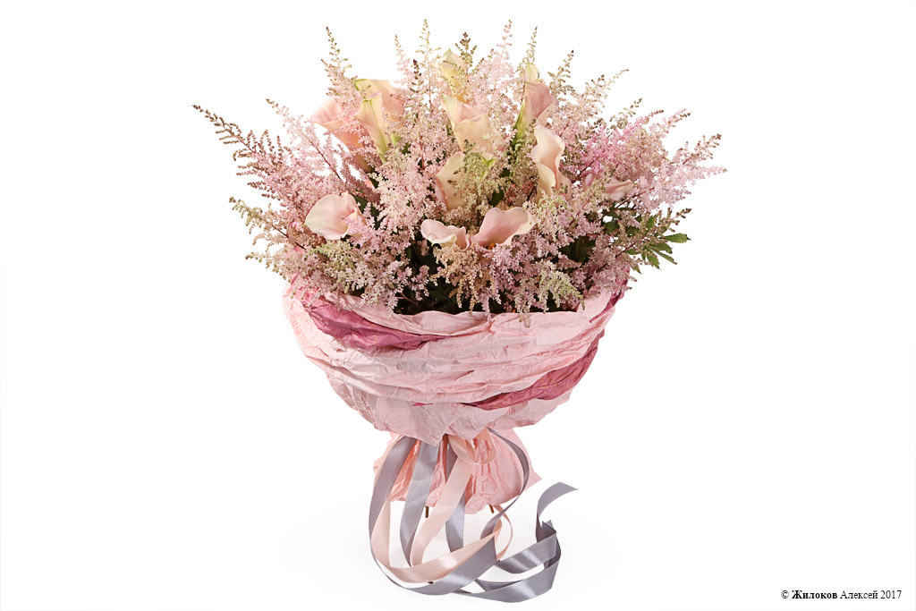 Оригинальный и нетривиальный бело-розовый букет, составленный из великолепных калл и веточек астильбы. Такой подарок выскажет всю нежность и трепетность испытываемых Вами чувств к адресату букета, приятно удивит и поразит любимого человека и сделает поздравление незабываемым!