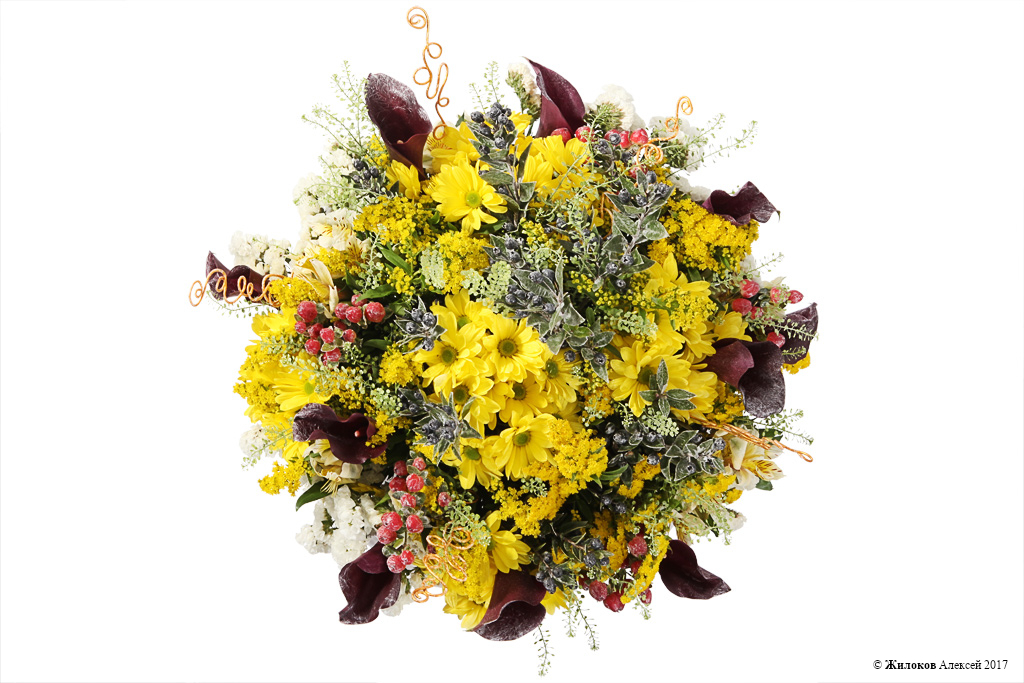 Состав: Альстромерия - 10Калла - 10 Хризантема кустовая - 5 Гиперикум - 5 Статица - 1 Мирто - 1 Солидаго - 10 Ярутка - 1 |