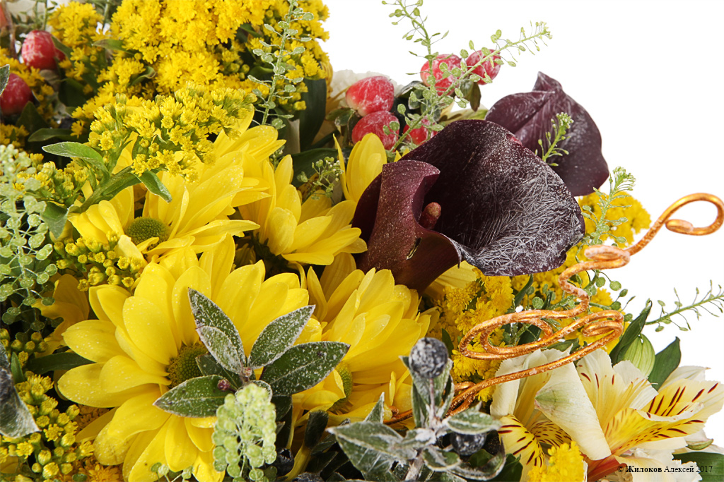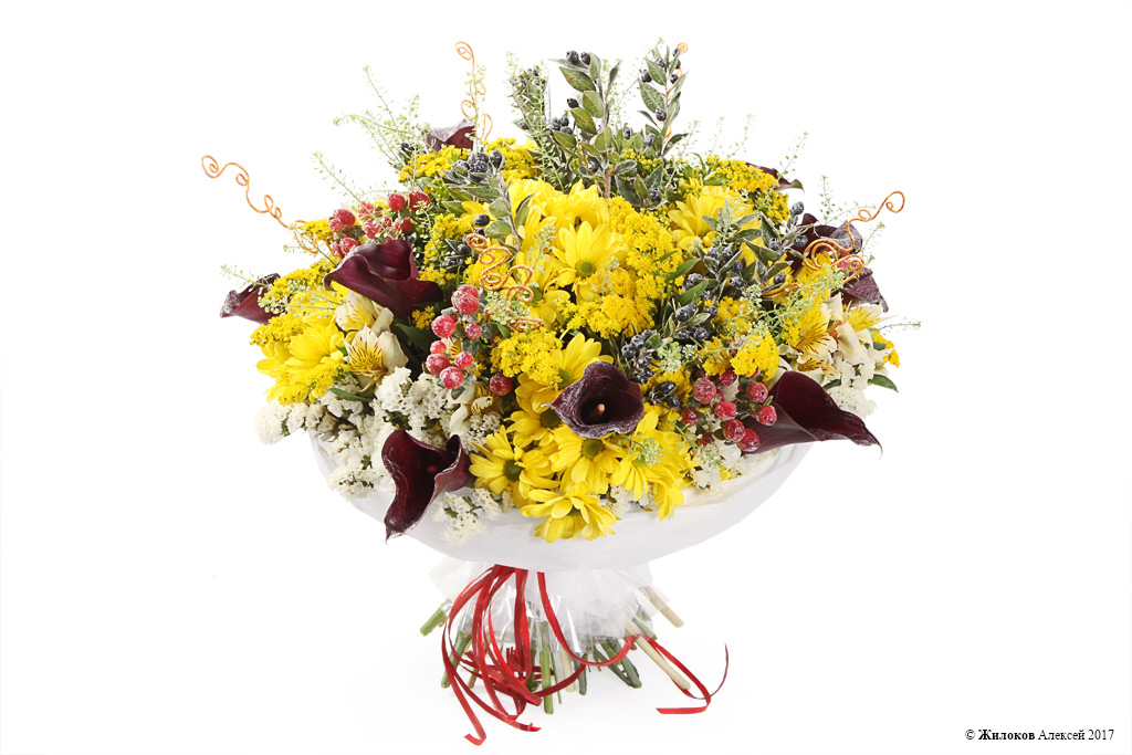 Описание: Очаровательный и прелестный подарок на любое торжество – ярко-желтый букет из солнечных хризантем, бордовых калл, нежных альстромерий, красных ягодок гиперикума и сочной зелени. Жизнеутверждающая композиция вызовет улыбку радости на лице адресата, передаст Ваши самые лучшие пожелания! |