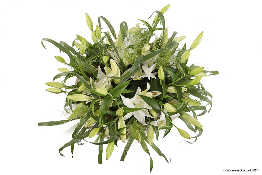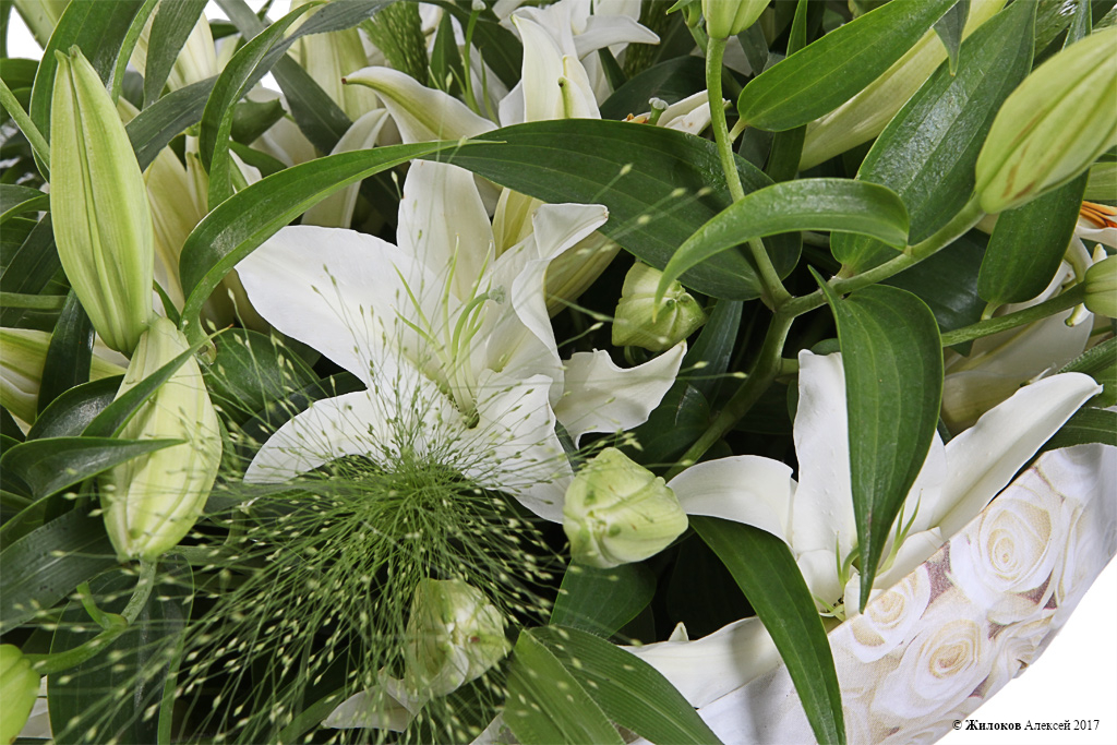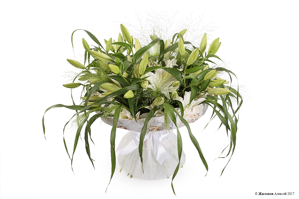 Букет из белоснежных лилий и свежей зелени паникума завораживает своей изысканностью и натуральной красотой. Роскошные цветы символизируют непорочность, чистоту помыслов и искренность Ваших чувств. Такого подарка достойны только самые близкие и любимые люди!