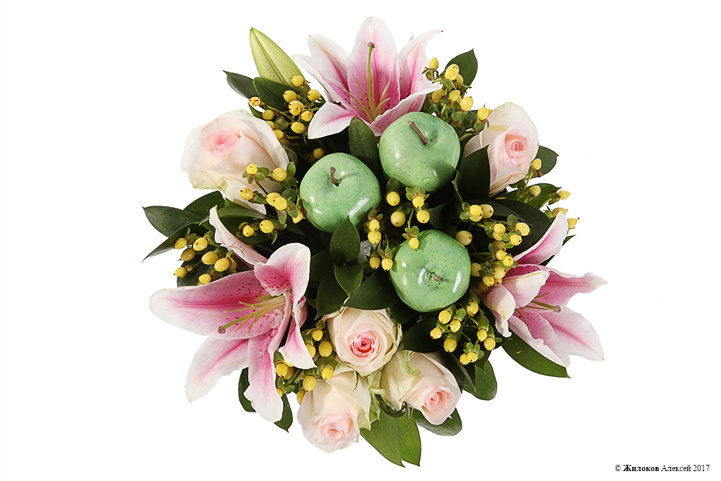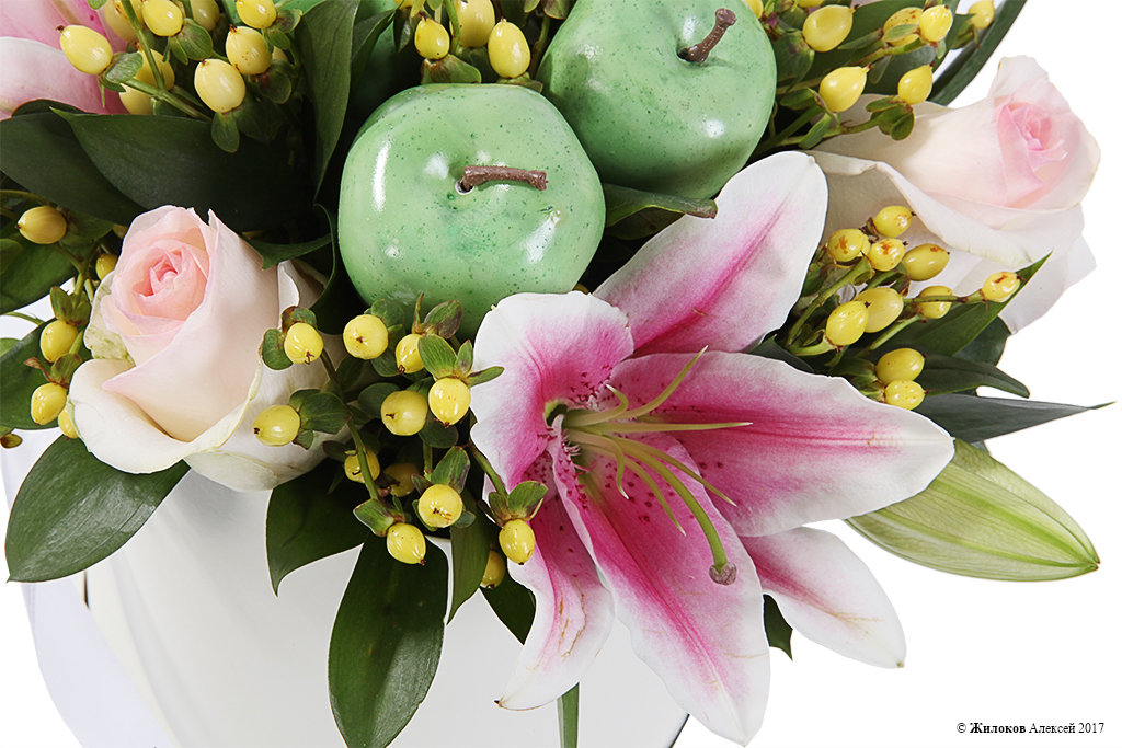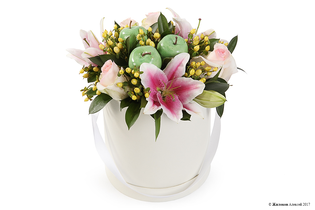 Состав: Роза одноголовая (Эквадор) - 5Лилия - 1 Рускус - 5 Гиперикум - 10 Декор "Яблоко" - 3 Коробка круглая 18х19 (белая) - 1 |