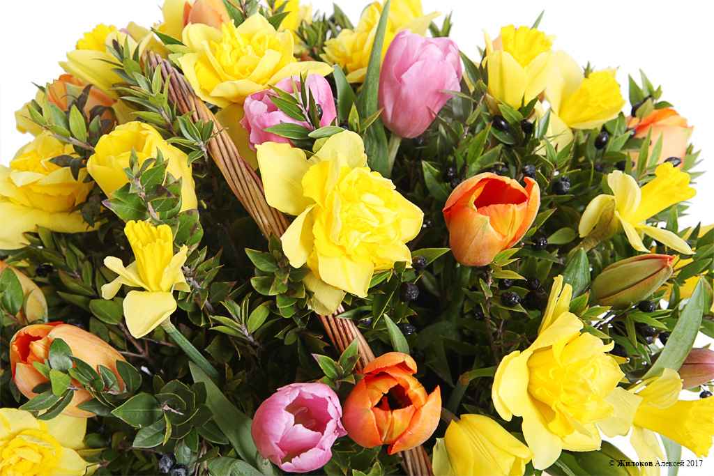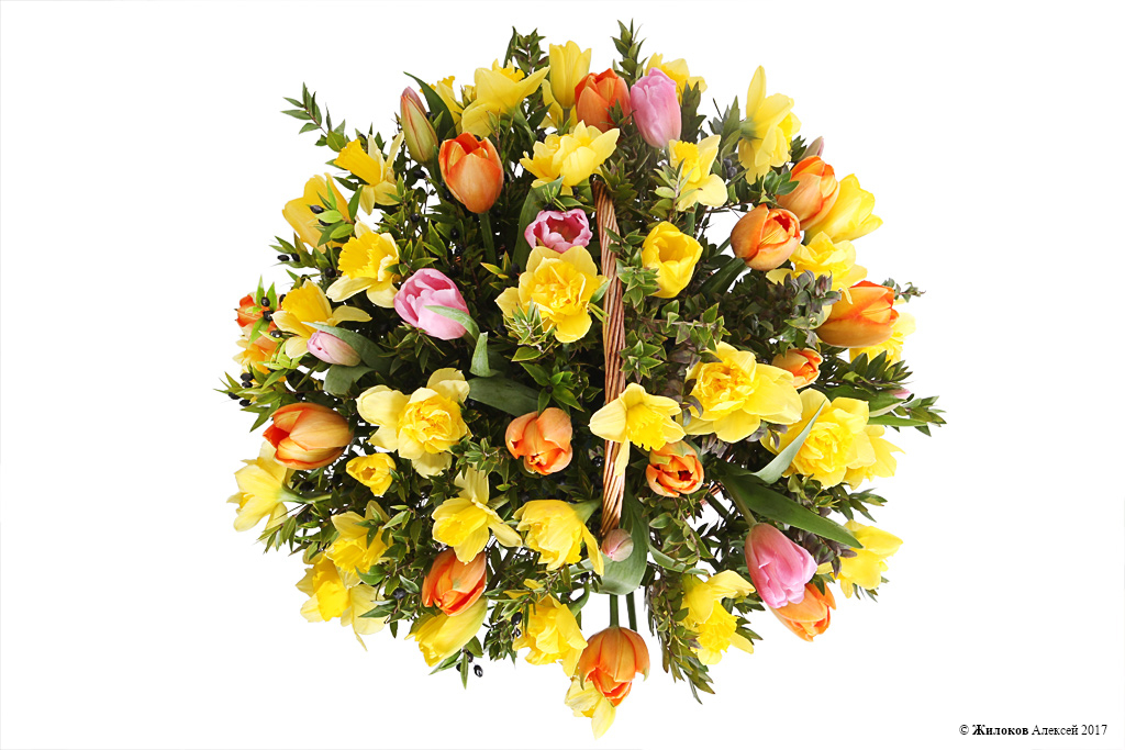 Состав: Нарцисс (деффодайл) - 30Тюльпан - 30 Мирто - 3 Корзина малая - 1 |