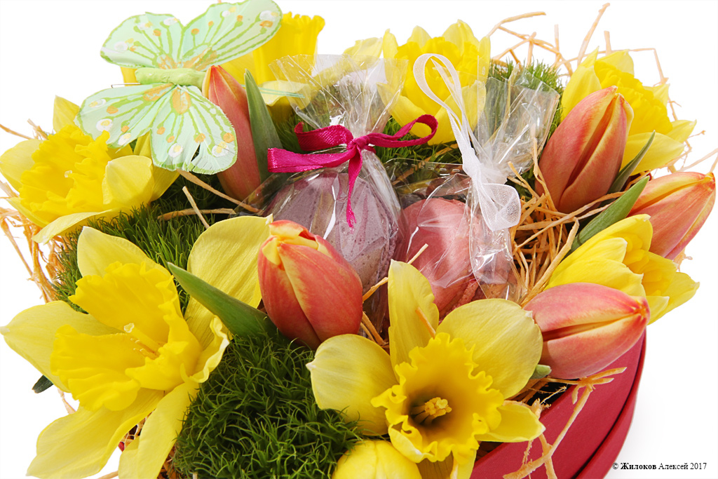Миниатюрная, но изысканная цветочная композиция, будто наполненная солнечным светом и ласковым теплом, станет чудесным сюрпризом и разбудит яркие чувства и эмоции во время долгой зимы! Такой подарок можно преподнести как к празднику, так и в обычный будничный день – нарциссы и тюльпаны выглядят просто и нежно, и не требуют особого повода. А пирожные макарун, входящие в композиция, придутся по вкусу любому сладкоежке. |