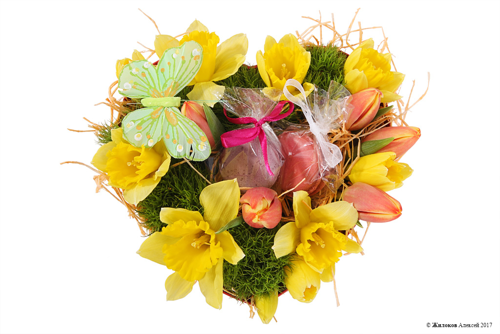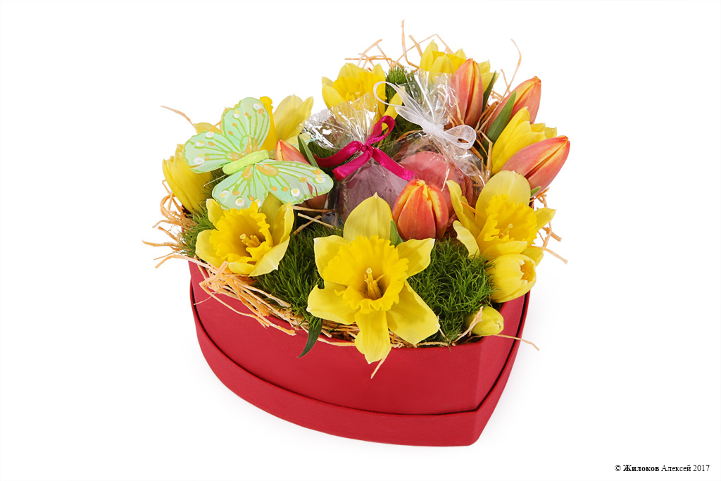 Состав: Нарцисс (деффодайл) - 10Тюльпан - 5 Грин Трикс - 5 Пирожное макарун - 2 Декор "Бабочка" - 1 Коробка "Сердце" мини (19х17х9) - 1 |