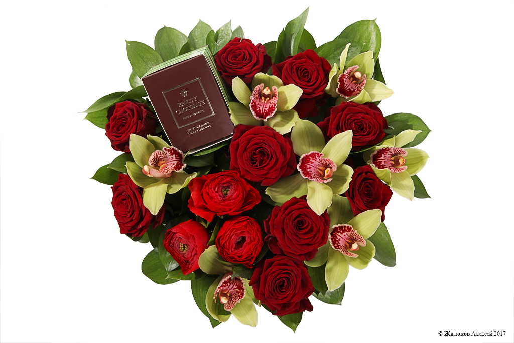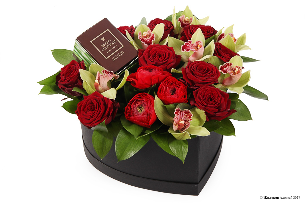 Состав: Роза Ред Наоми - 9Ранункулюс - 3 Орхидея Цимбидиум - 1 Рускус - 10 Удлинители для орхидей - 7 Коробка "Сердце" 30х25х16 (черное) - 1 |
