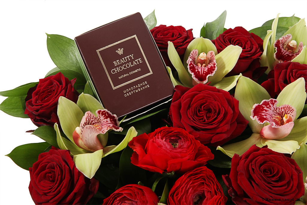Прекрасная цветочная композиция, которая может выступить как в качестве оригинального признания в любви, так и просто милого комплимента для прекрасной натуры! А входящее в композицию шоколадное обертывание для тела станет желанным и романтичным подарок для любой девушки!