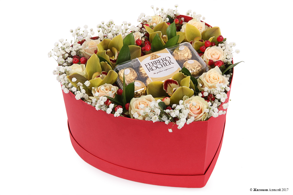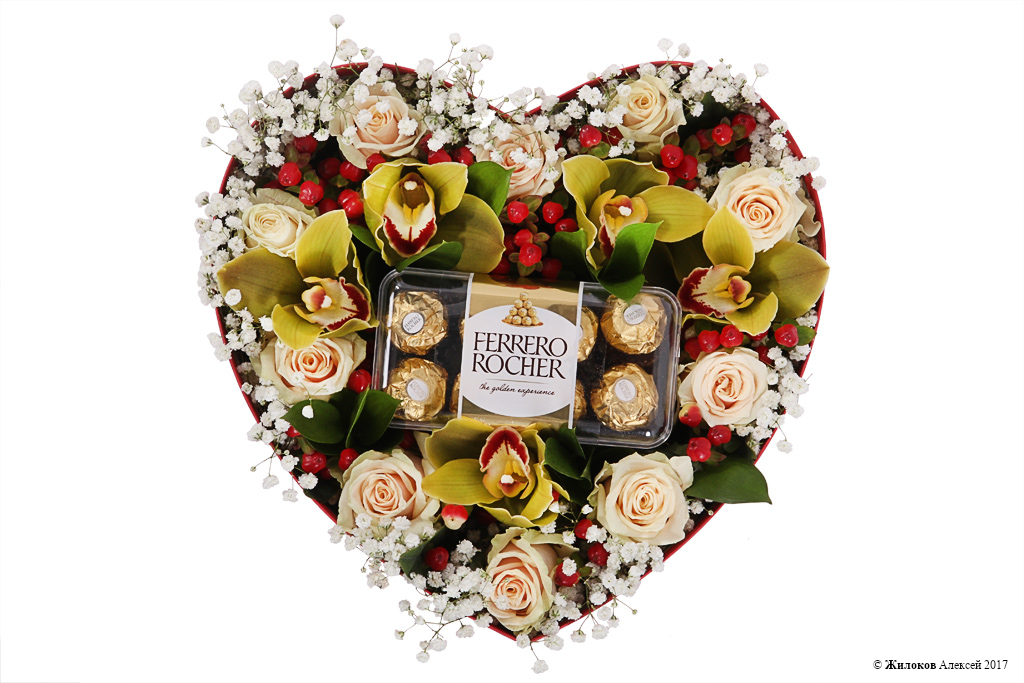 Состав: Роза Талея - 10Орхидея Цимбидиум - 1 Гипсофила - 2 Рускус - 3 Гиперикум - 10 Удлинители для орхидей - 5 Набор конфет Ferrero Rocher, 200 г - 1 Коробка "Сердце" 30х25х16 (красное) - 1 |