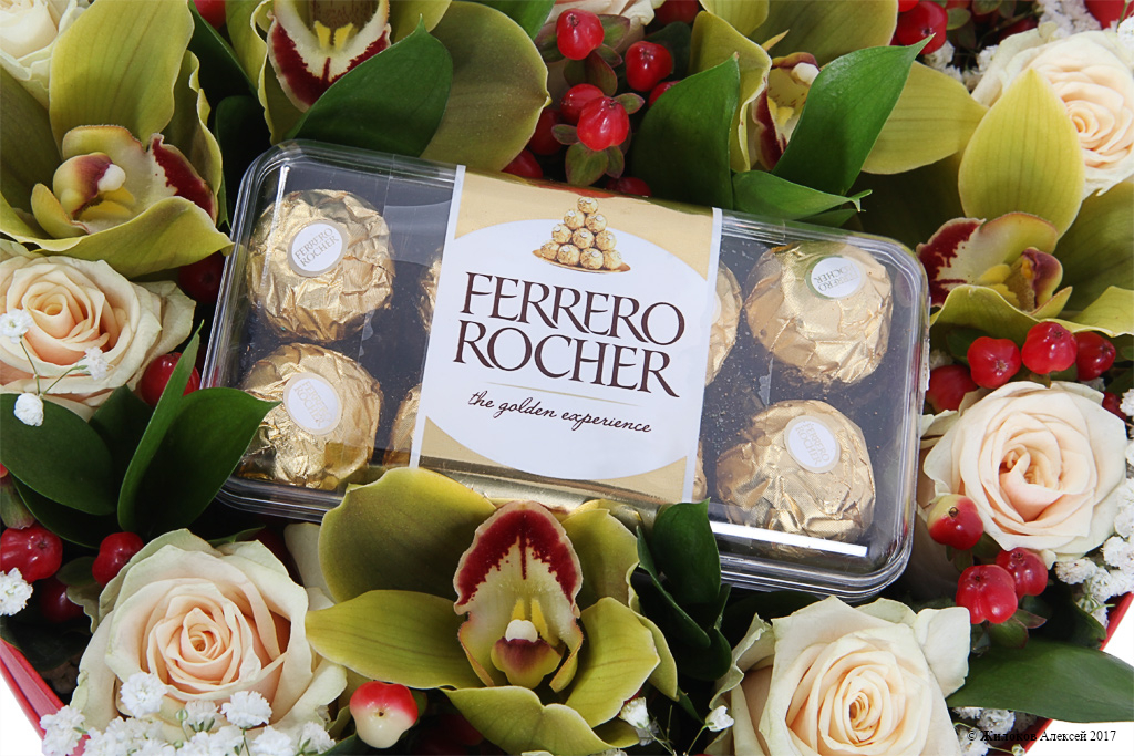 Такой подарок сочетает в себе 2 удовольствия - это эстетическое удовольствие от великолепной цветочной композиции и сладкое удовольствие от вкуснейшего набора шоколадных конфет Ferrero Rocher! Беспроигрышный вариант презента для сладкоежки!