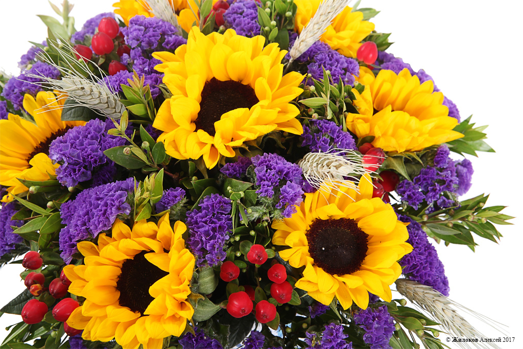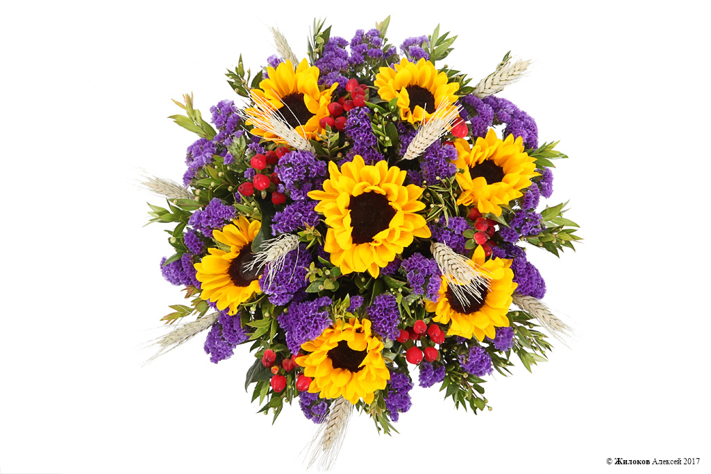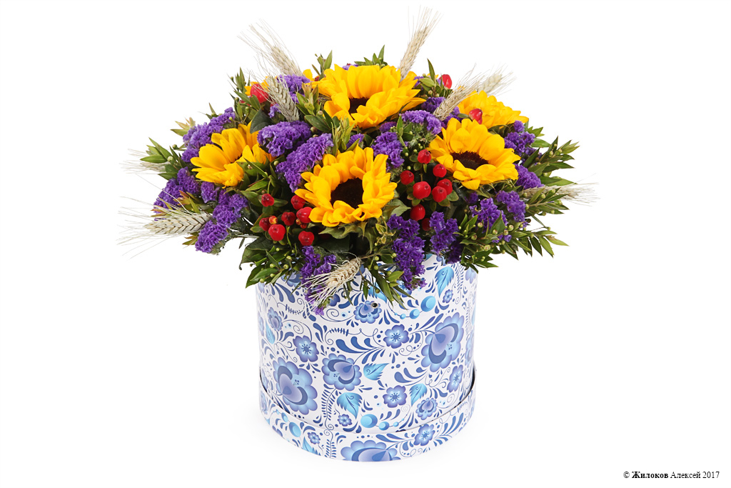 Состав: Подсолнух (гелиантус) - 7Статица - 1 Гиперикум - 6 Мирто - 1 Пшеница (тритикум) - 10 Коробка круглая "Гжель" (21х21) - 1 |