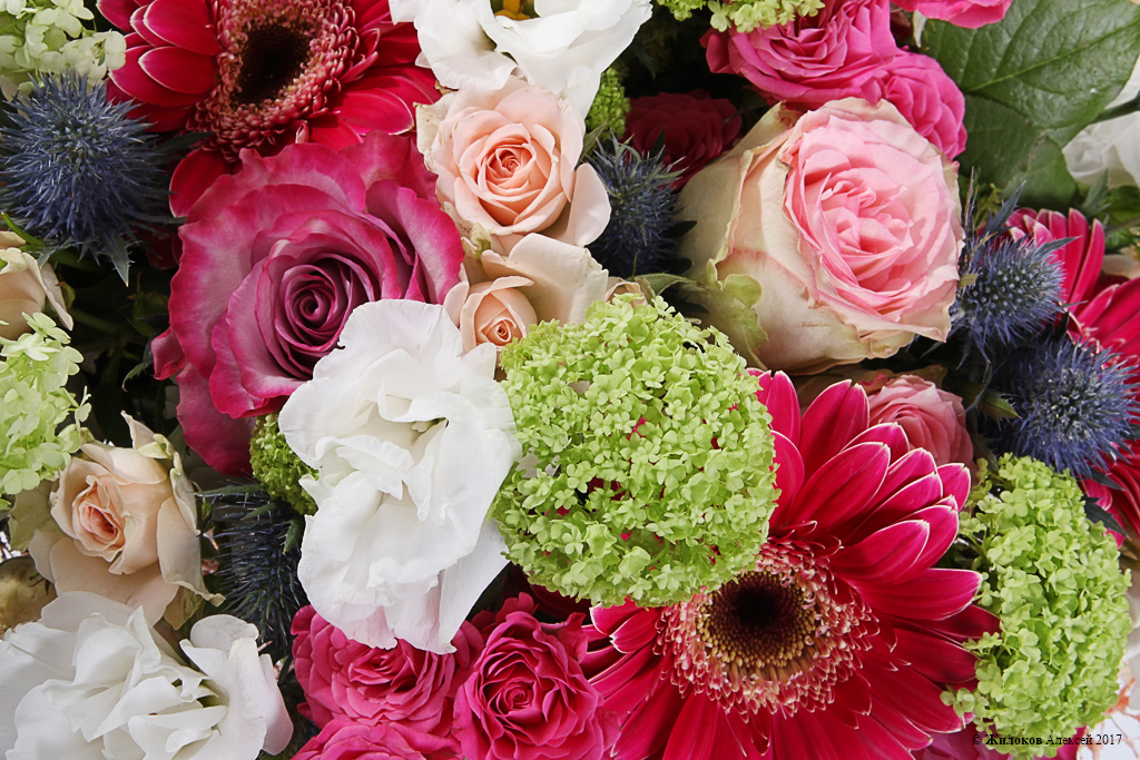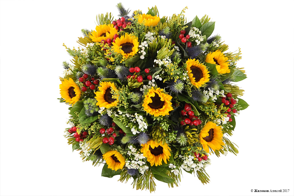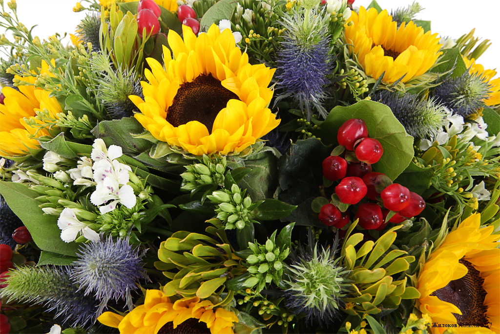Состав: Диантус барбатус (гвоздика турецкая) - 2Платиспермум - 2 Салал - 1 Солидаго - 10 Гиперикум - 10 Эрингиум - 10 Подсолнух (гелиантус) - 11 |