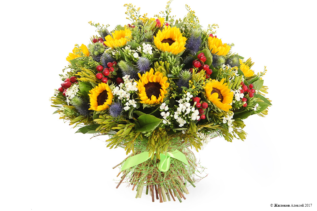Описание: Пышный букет из летних цветов и сочной зелени, главные ноты в котором играют крупные желтые подсолнухи – вот подарок, который придется кстати на любом празднике и торжестве. Прекрасные солнечные цветы воплощают самые яркие, светлые и позитивные пожелания счастья и успехов.