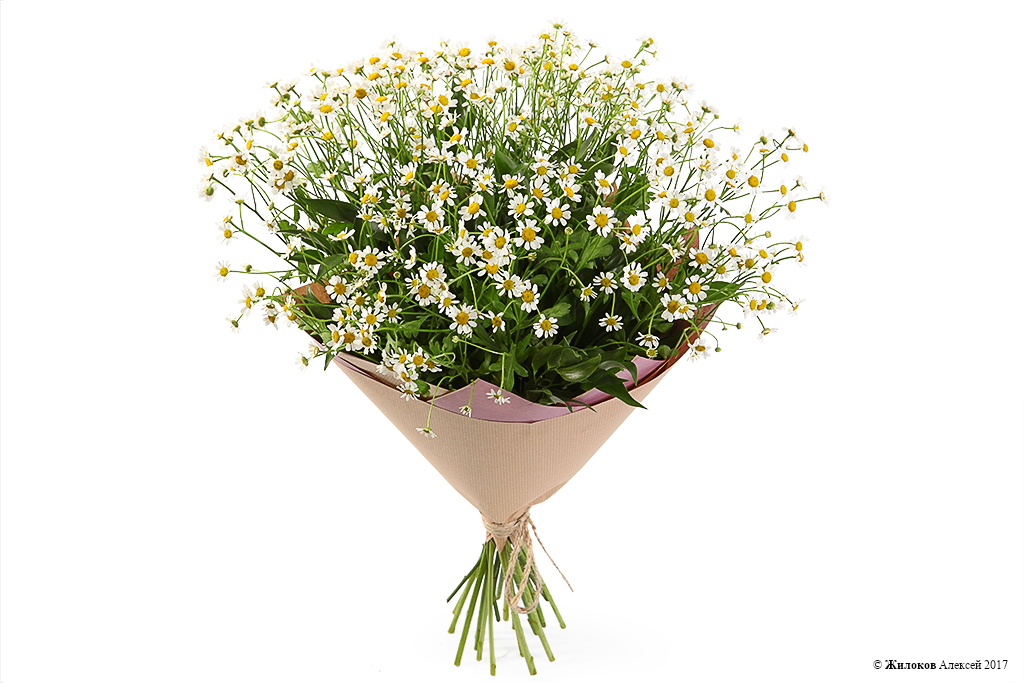 Белоснежная ромашка в сочетании с декоративной зеленью рускуса навевает воспоминания о теплом лете, запахе луговых цветов, о прекрасной беззаботной поре. Такой букет идеально подойдет для творческих и мечтательных натур.