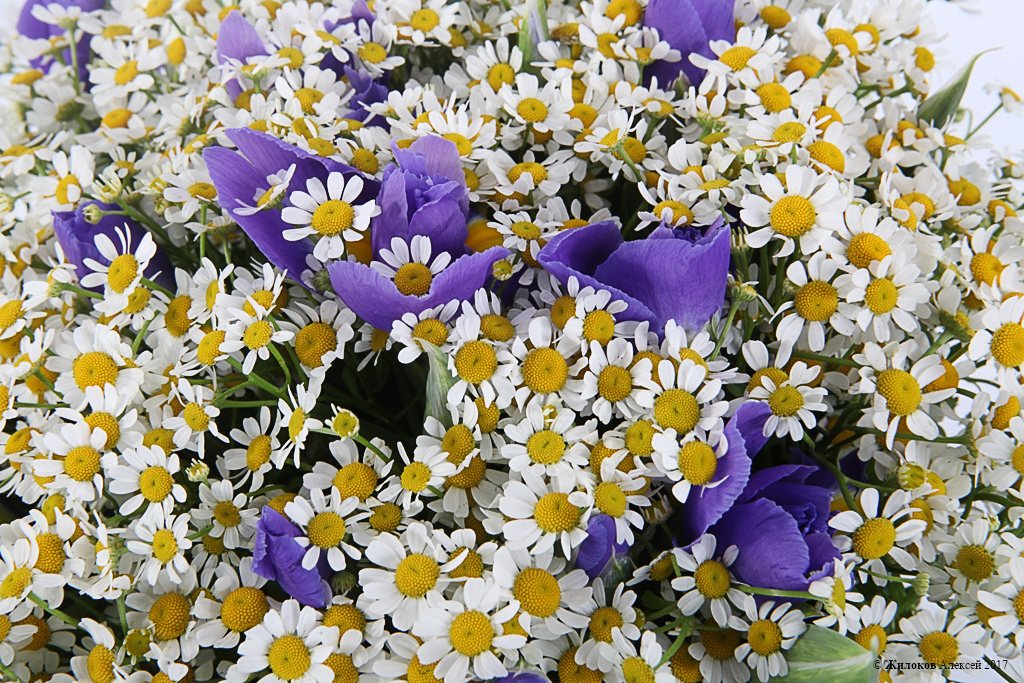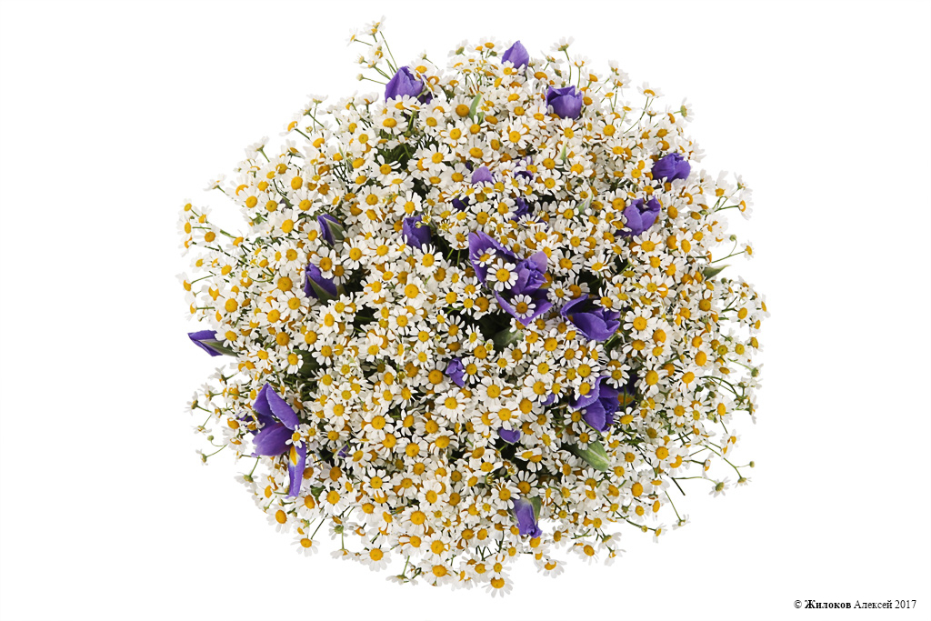 Состав: Танацетум Вегмо (ромашка) - 30Ирис - 2 Коробка круглая 24х27 (голубая) - 1 |
