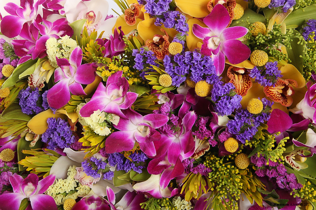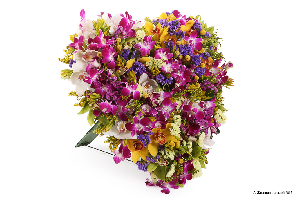 Состав: Орхидея Цимбидиум - 3Орхидея Дендробиум - 50 Статица - 3 Морея - 10 Платиспермум - 1 Солидаго - 10 Краспедия - 30 Оазис-сердце - 1 Удлинители для орхидей - 45 |