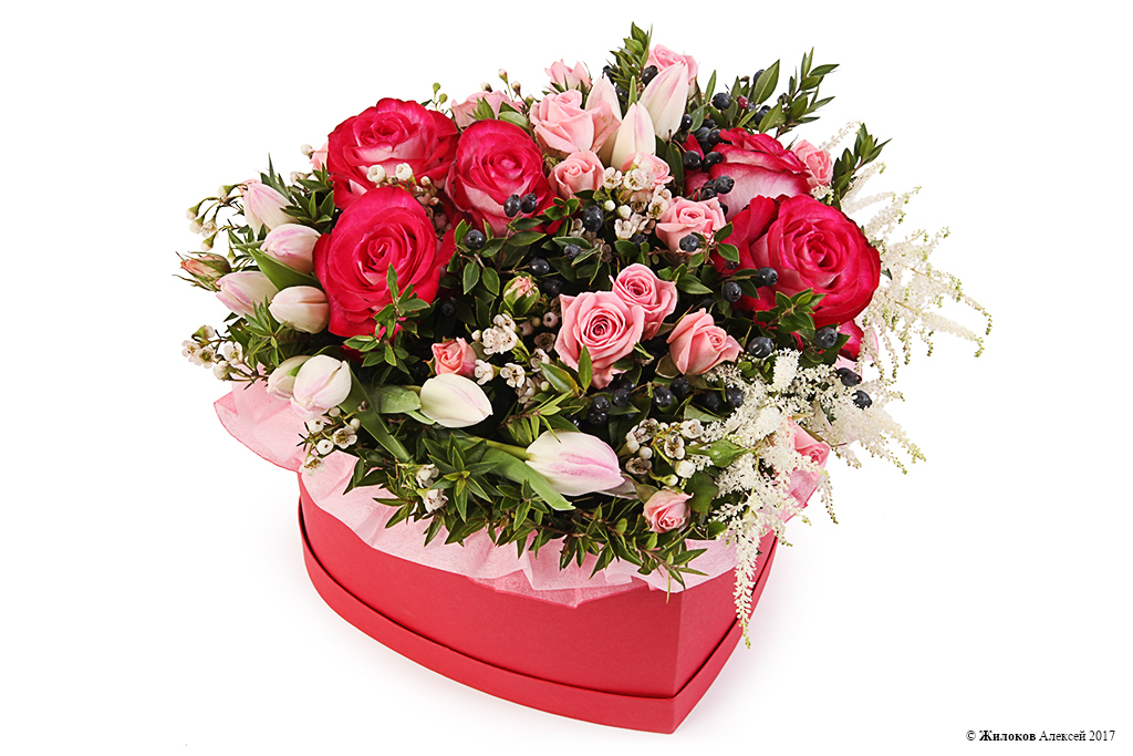 Изумительно нежная цветочная композиция в коробке в форме сердца - это подарок, который расскажет о Вашем восхищении получателем букета лучше любых слов. Оттенки розового, красного, белого передадут в полной мере всю искренность, нежность и непорочность Ваших чувств. Романтичный и трогательный подарок!