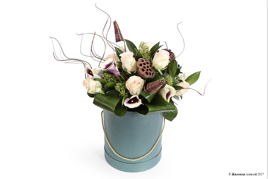 Описание: Элегантная, стильная и современная цветочная композиция из прекрасных роз с белыми бутонами с розовой серединкой, двухцветных калл, аспидистры и скиммии. Оригинальным такой букет делает фантастический декор, а голубая шляпная коробка добавляет шарма. Все эти особенности делают эту композицию идеальным вариантом подарка для творческих и неординарных личностей! |