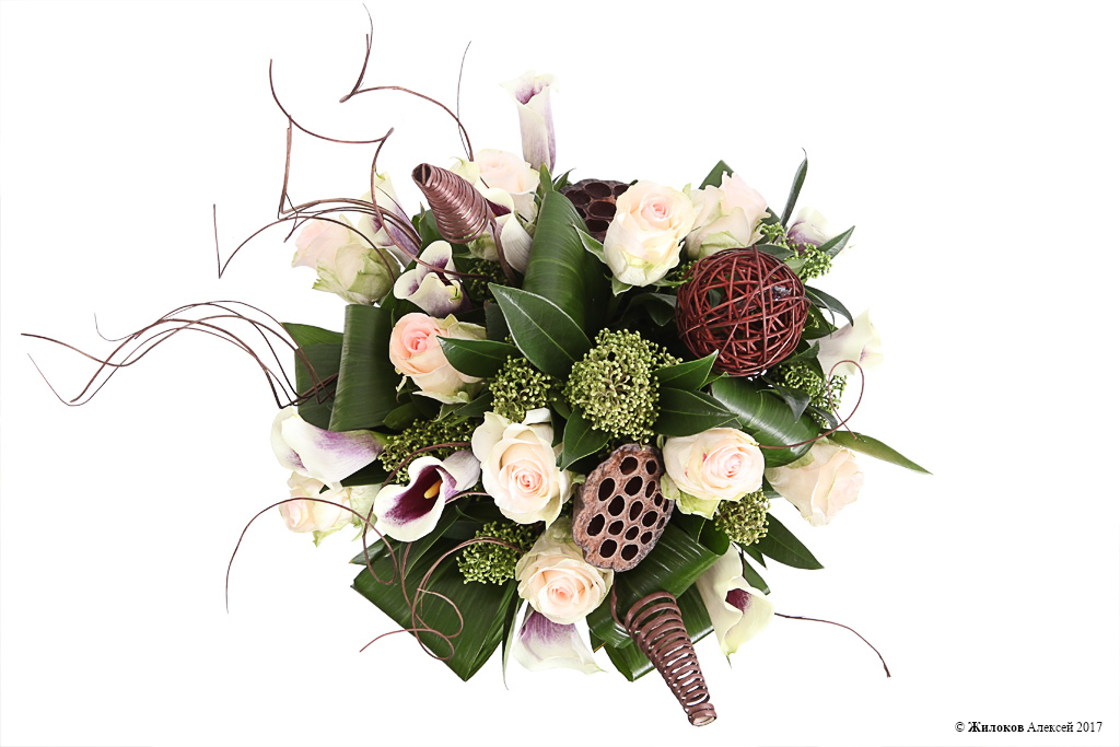 Состав: Роза Сеньорита - 10Калла - 10 Скиммия - 1 Аспидистра - 11 Ветка декоративная (100 см) - 1 Коробка круглая 24х27 (большая) - 1 |