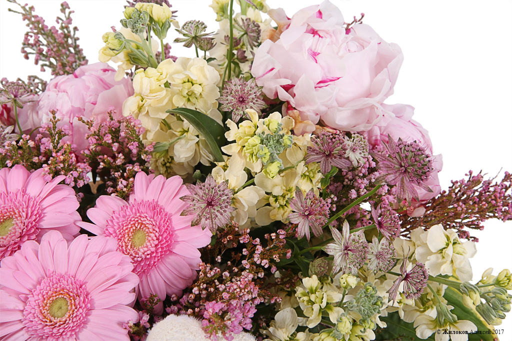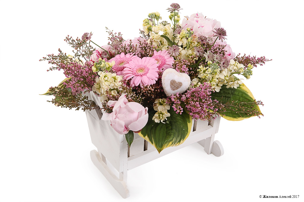 Состав: Кашпо "Колыбель" - 1Пион - 5 Гербера мини - 3 Астрантиа - 5 Маттиола - 9 Хоста - 5 Эрика - 1 Декор "Сердце" - 1 |