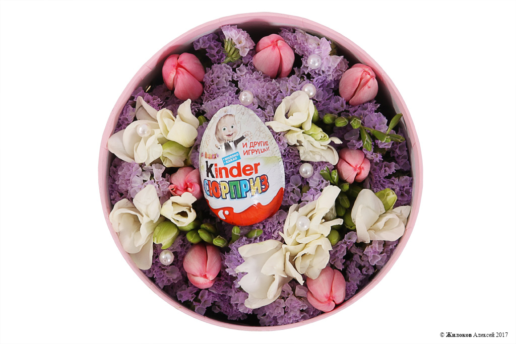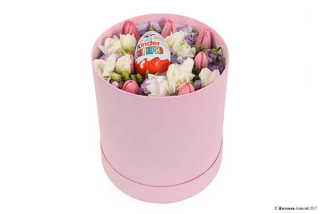 Состав: Тюльпан - 7Фрезия - 5 Статица - 1 Шоколадное яйцо «Киндер сюрприз» - 1 Коробка круглая 18х19 (розовая) - 1 |