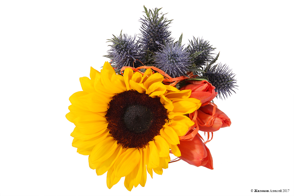 Состав: Подсолнух (гелиантус) - 1Тюльпан - 3 Эрингиум - 1 Коробка для цветов 9х9 (мини) - 1 |