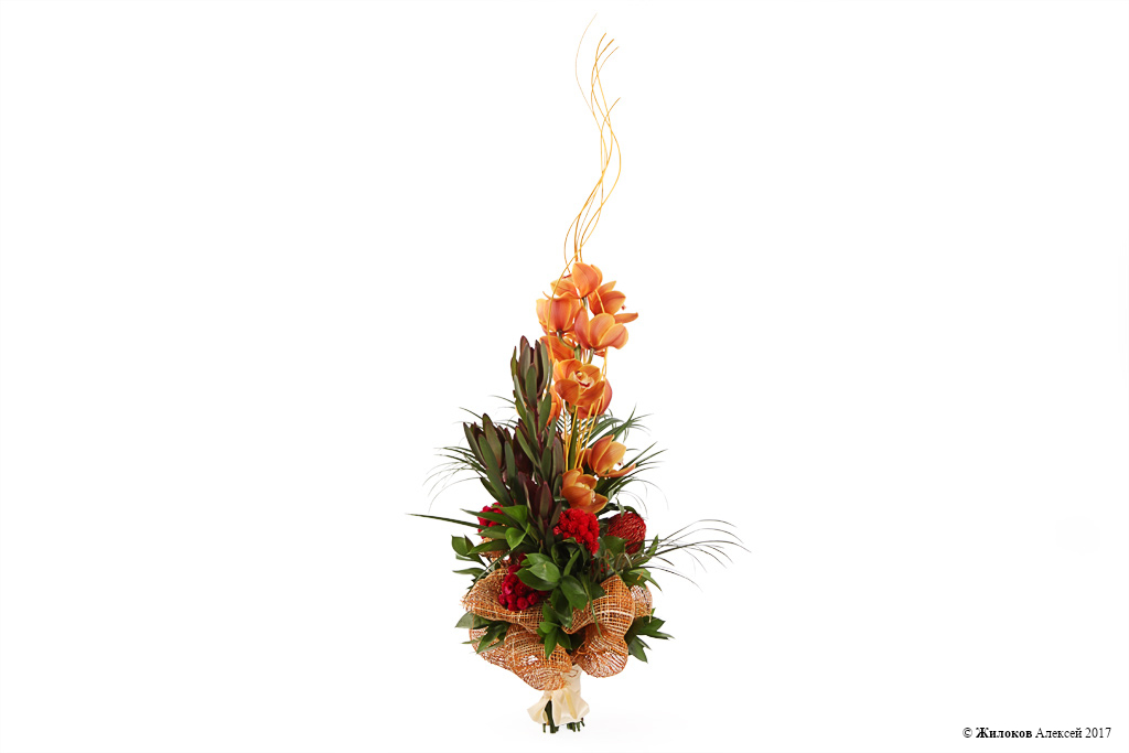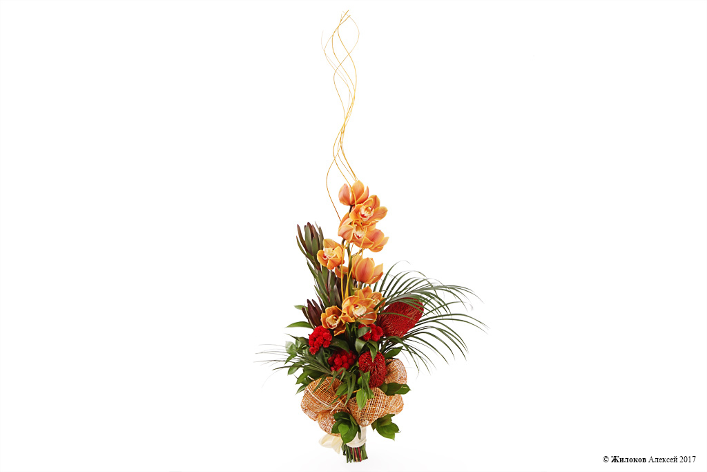 Описание: Роскошный вертикальный букет из экзотических банксий и изысканных орхидей – идеальный подарок, который одинаково понравится и подойдет и любимой женщине, и строгому руководителю. Острые пальмовые листья и красноватая зелень леукадендрона, декоративные высокие ветки добавляют цветочной композиции изысканности и делают ее уникальным и дорогим подарком. |