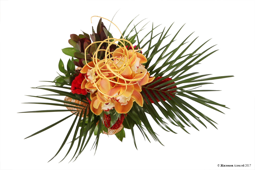 Состав: Ветка декор. микс 130 см ива - 5Орхидея Цимбидиум - 1 Банксия - 2 Робелини - 3 Рускус - 15 Леукадендрон - 1 Гелихризум - 6 |