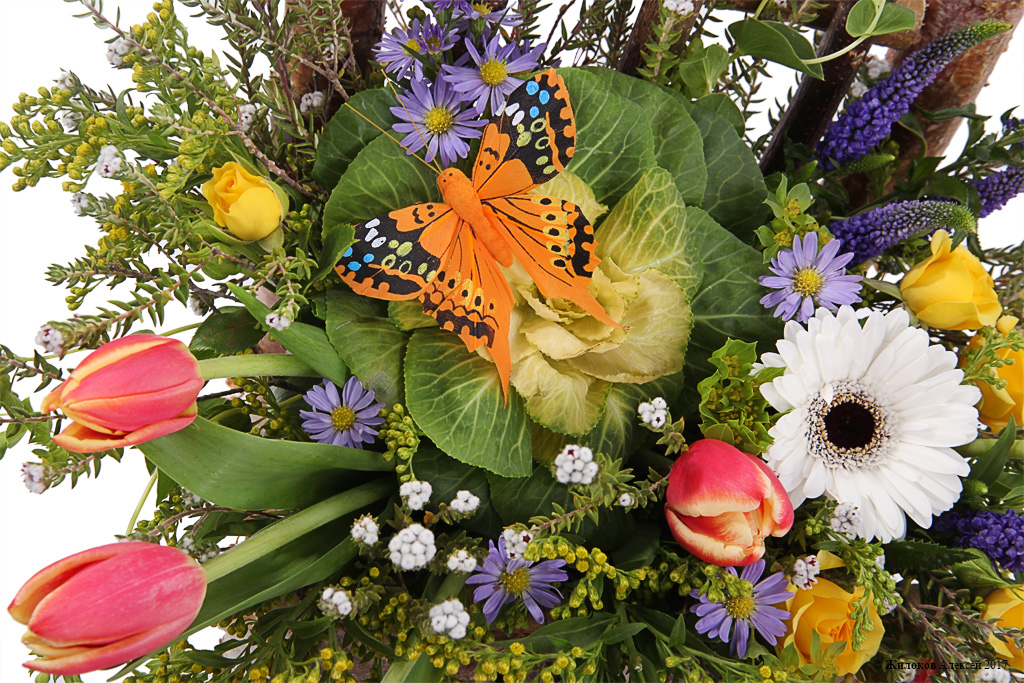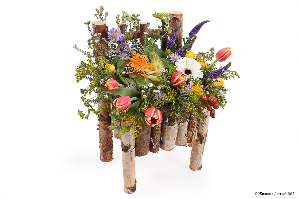 Состав: Роза кустовая (Кения) - 1Астра - 1 Тюльпан - 5 Гербера - 1 Коттон Буш - 1 Брассика - 1 Вероника - 5 Гиперикум - 1 Солидаго - 5 Кашпо "Стул" - 1 |