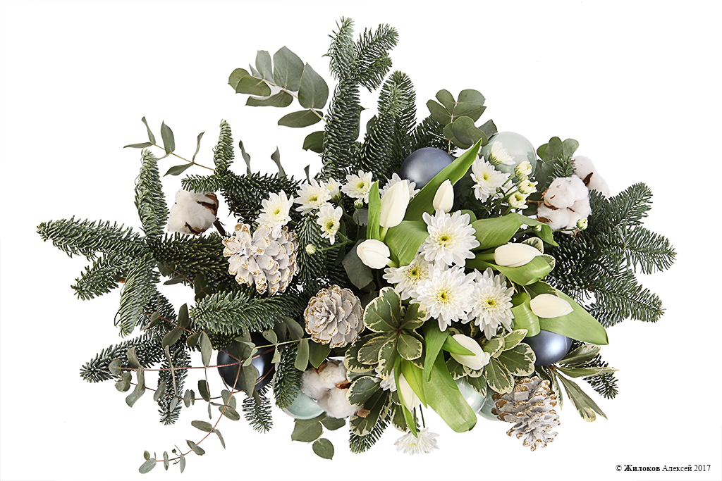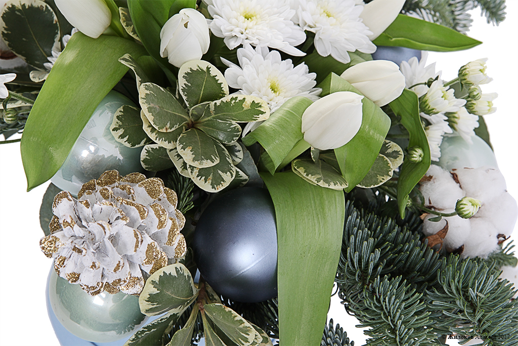 Состав: Нобилис - 2Тюльпан - 7 Хризантема кустовая - 1 Хлопок - 1 Эвкалипт - 1 Питоспорум - 1 Украшение "Шишка" - 3 Шар новогодний - 7 Коробка круглая 18х19 (голубая) - 1 |