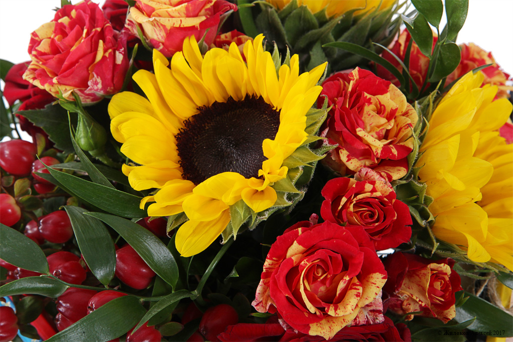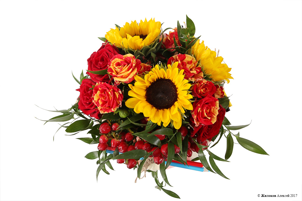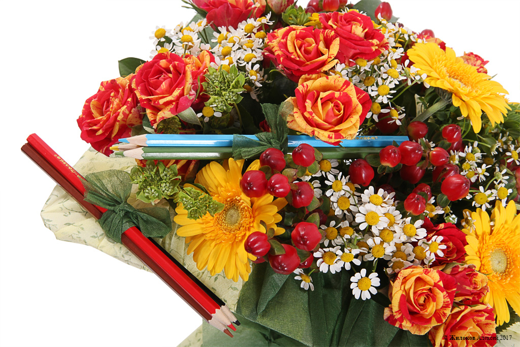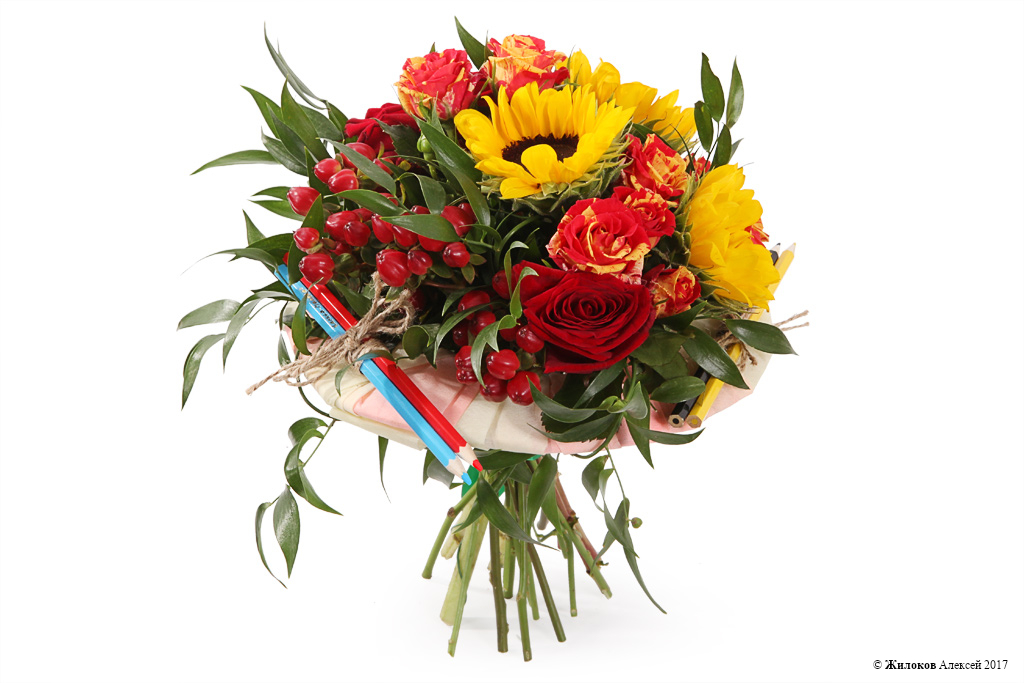 Описание: Небольшой и стильный букет из бордовых роз, желтых подсолнухов и красных плодов гиперикума оригинально украшен разноцветными цветными карандашами. Он станет отличным подарком любимому учителю и поможет выразить любовь и уважение. |
