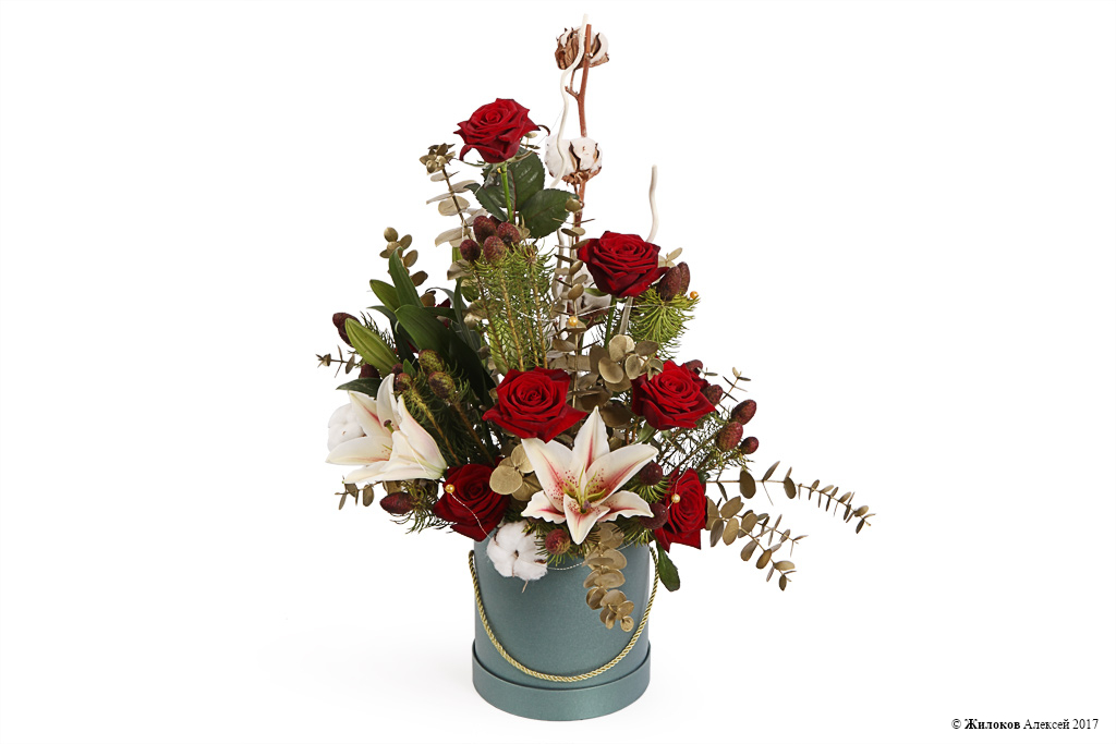 Высокий букет из красных роз, воздушного хлопка, звезд-лилий, словно небоскреб, стремится ввысь, к облакам. Еще большую оригинальность этой цветочной композиции придает шляпная коробка классической формы - такой подарок станет прекрасным украшение любого праздника.