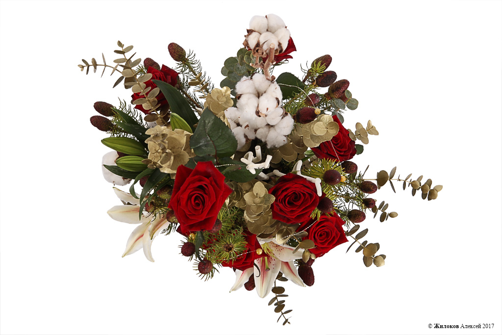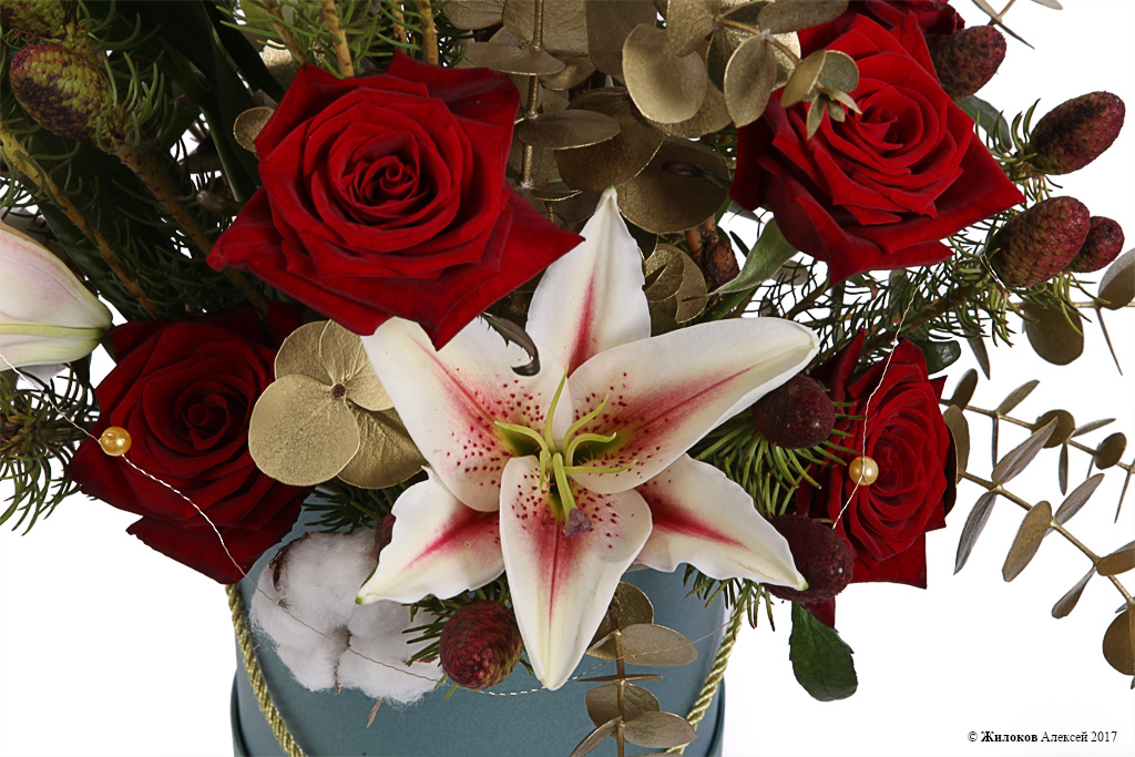 Состав: Роза Ред Наоми - 9Эвкалипт - 1 Хлопок - 1 Кумосум - 1 Лилия - 1 Ветка декоративная - 2 Коробка круглая 18х19 (малая) - 1 |